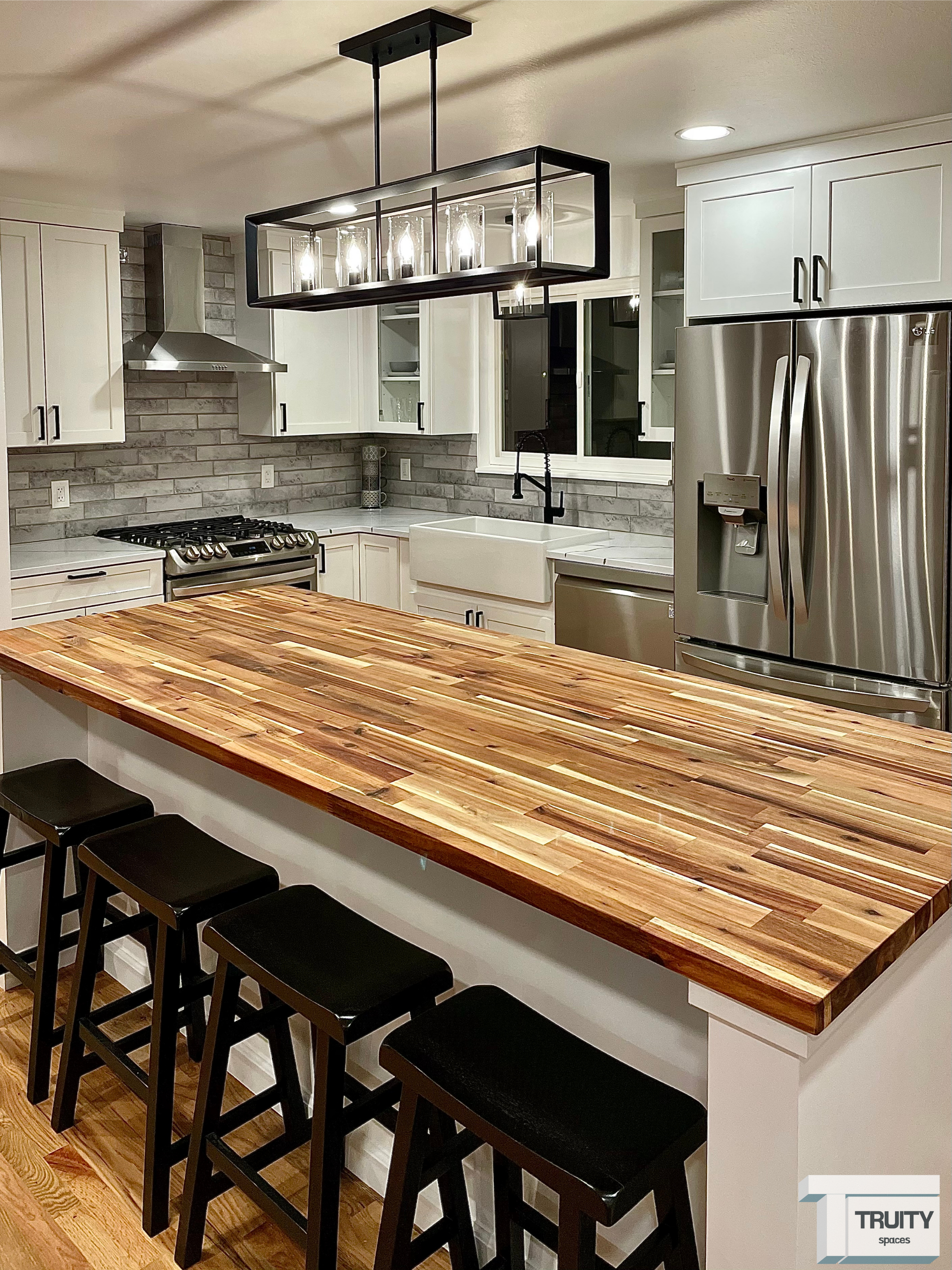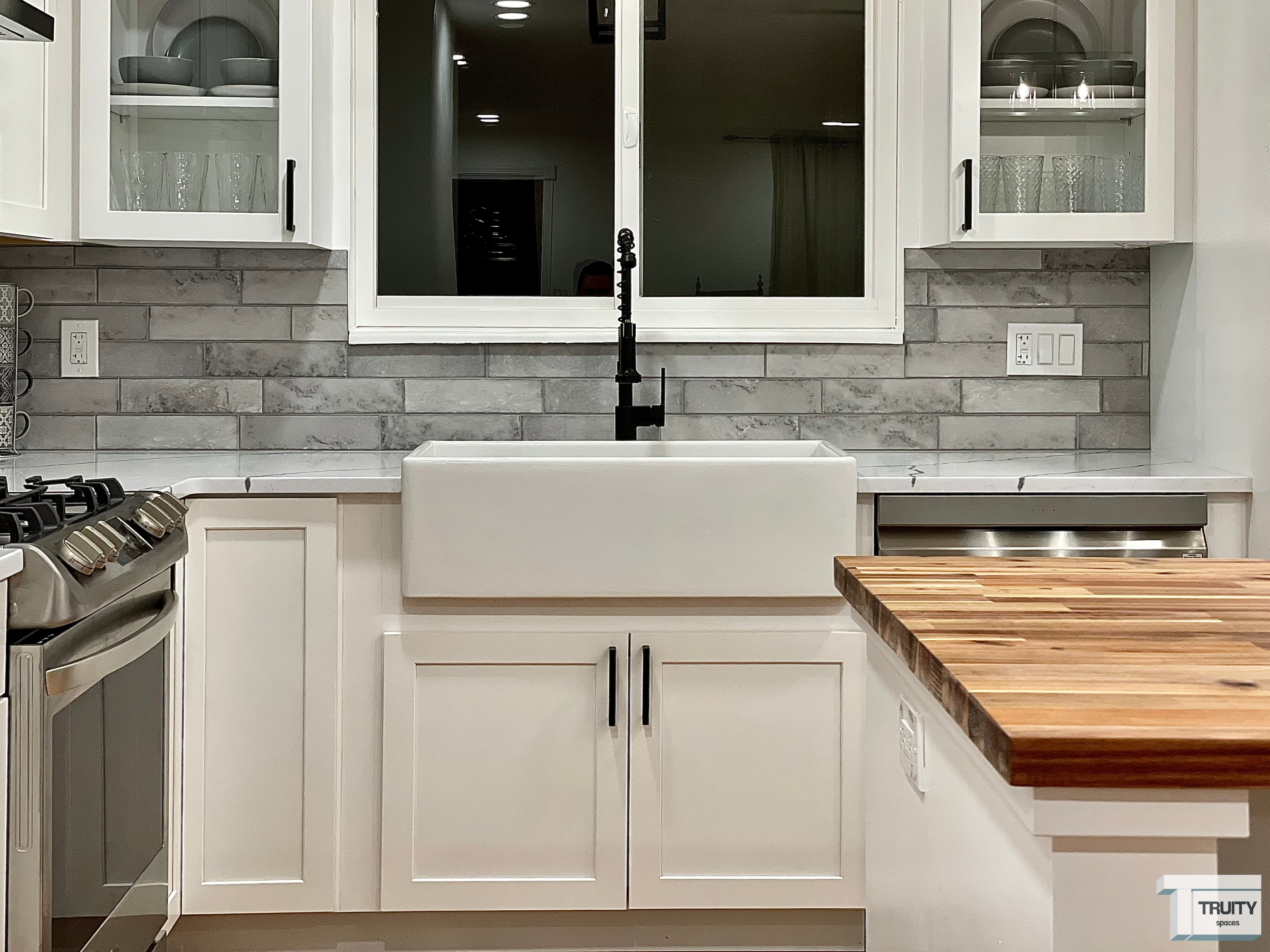 This space on Lamplighter street in Longmont is a modern and fun kitchen that combines wood accents with sleek elements and bold features. We started with an empty space, built a large island for additional storage and topped it off with a large butcherblock slab, which has been finished to match the wood floor. We installed pristine white cabinets and a white quartz countertop. An oversized farmhouse sink and new stainless steel appliances were installed. Gray glass subway tile was chosen for the backsplash to add some texture and complement the gray details on the countertops. The design was completed with matte black hardware and light fixtures. See all the before and after photos here.