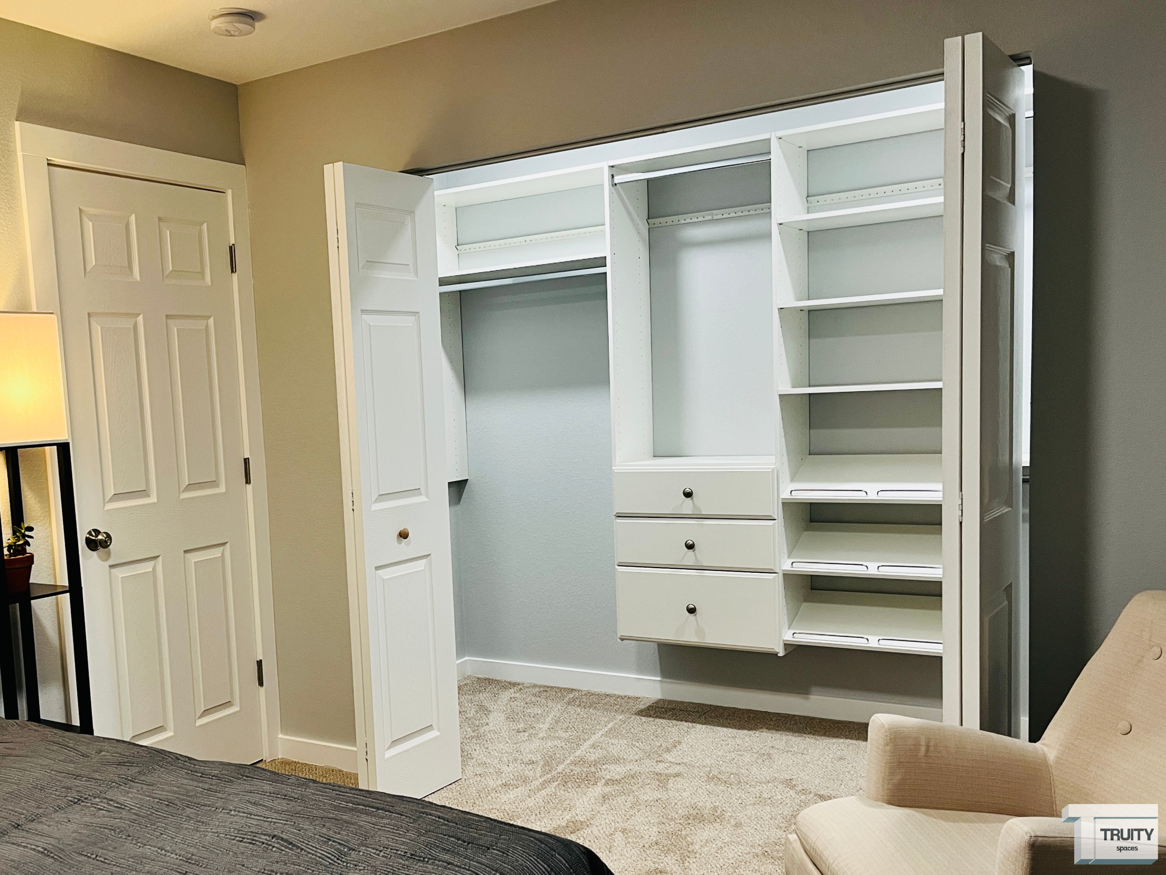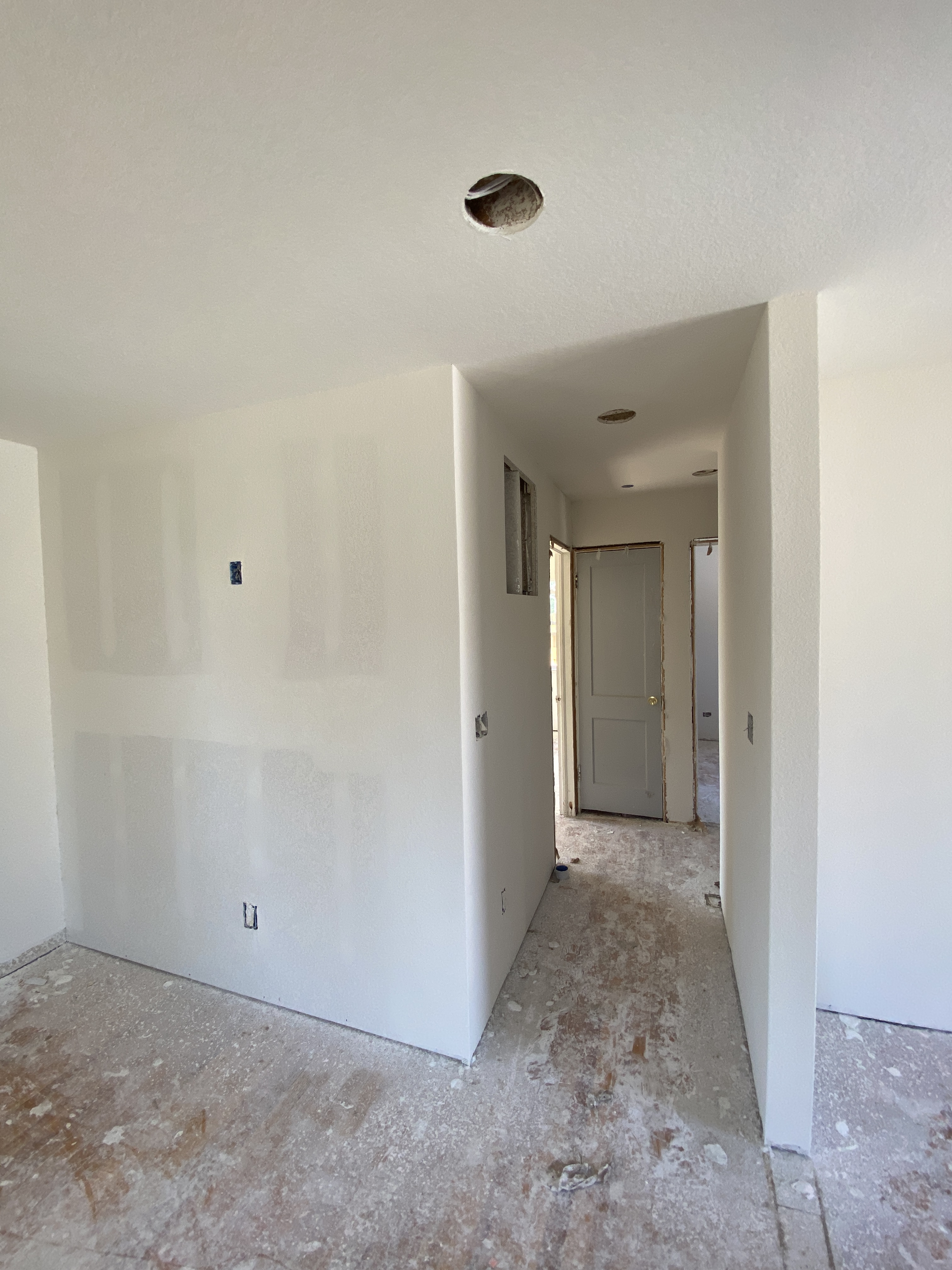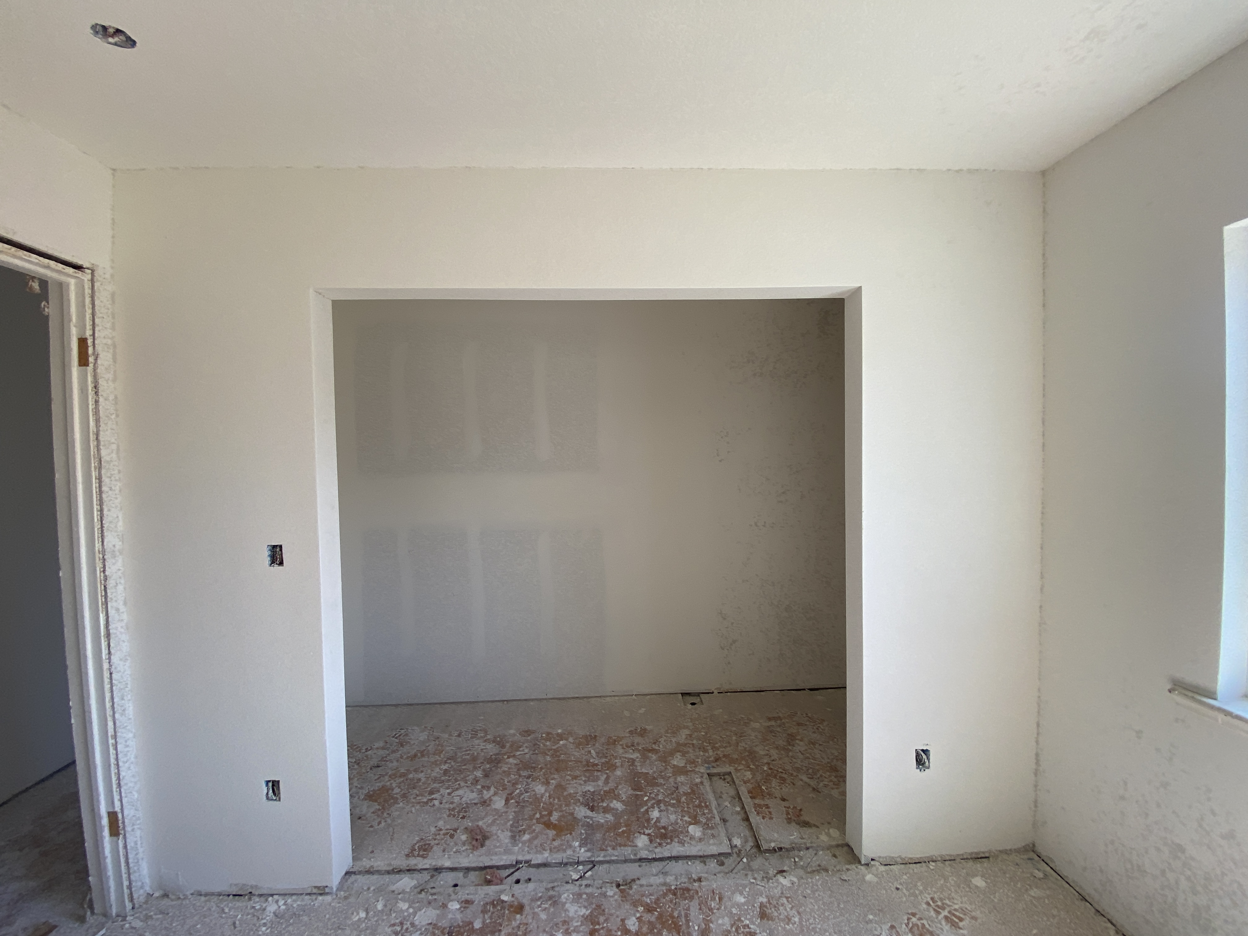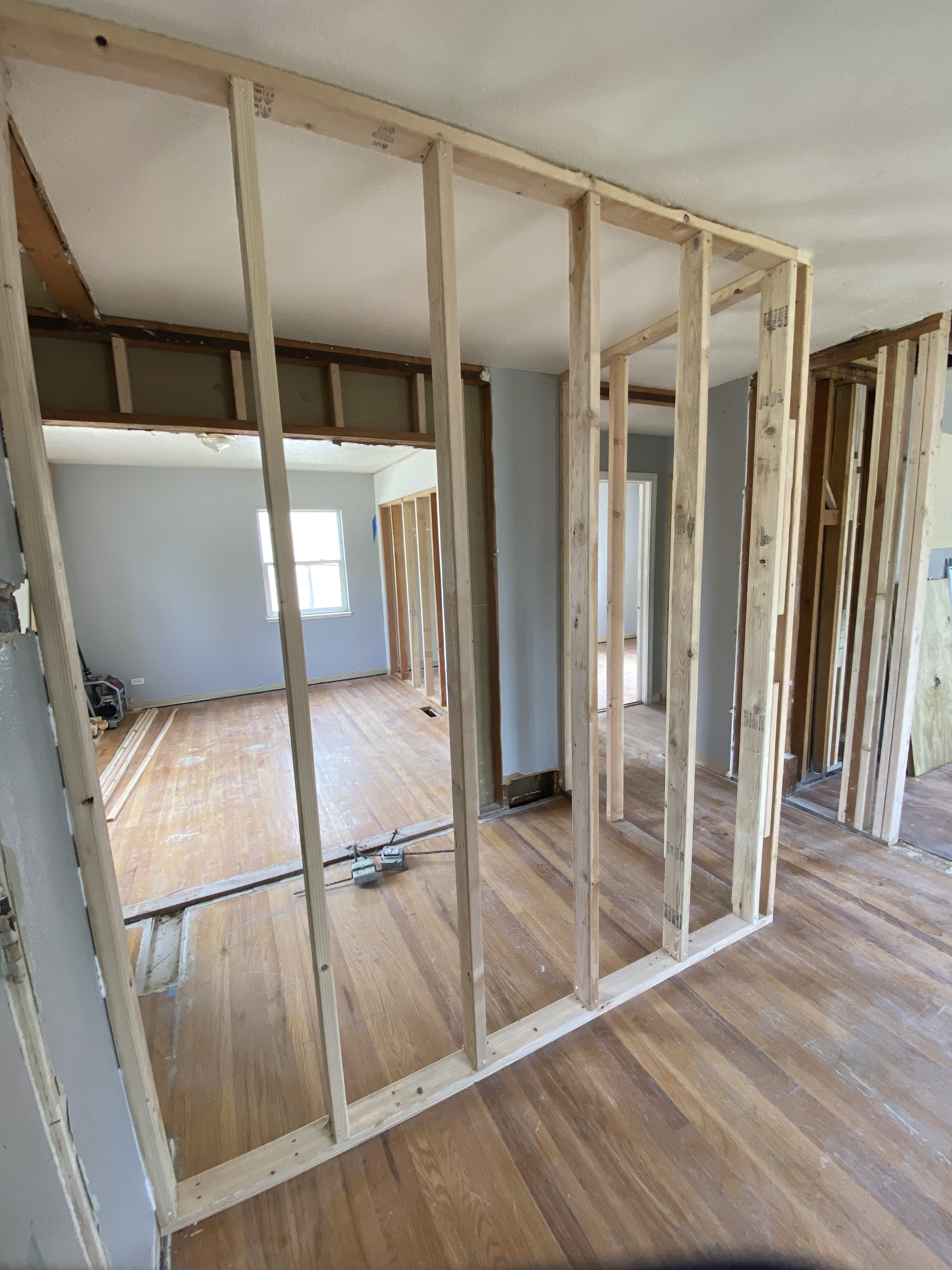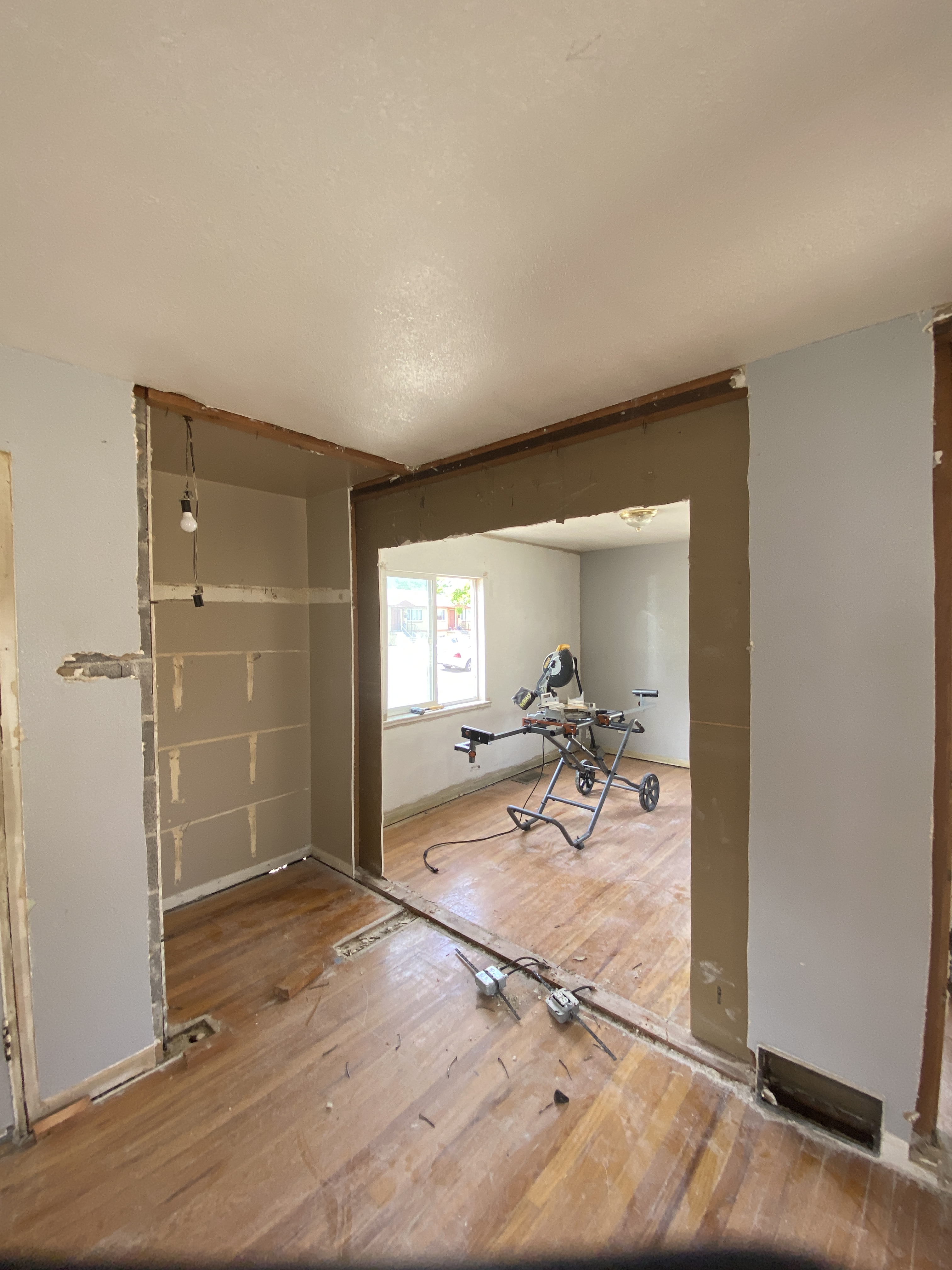 To add more functional closets, we framed into the living room from the primary bedroom to add a walk in closet, then combined the old tiny closets into one for the second bedroom.