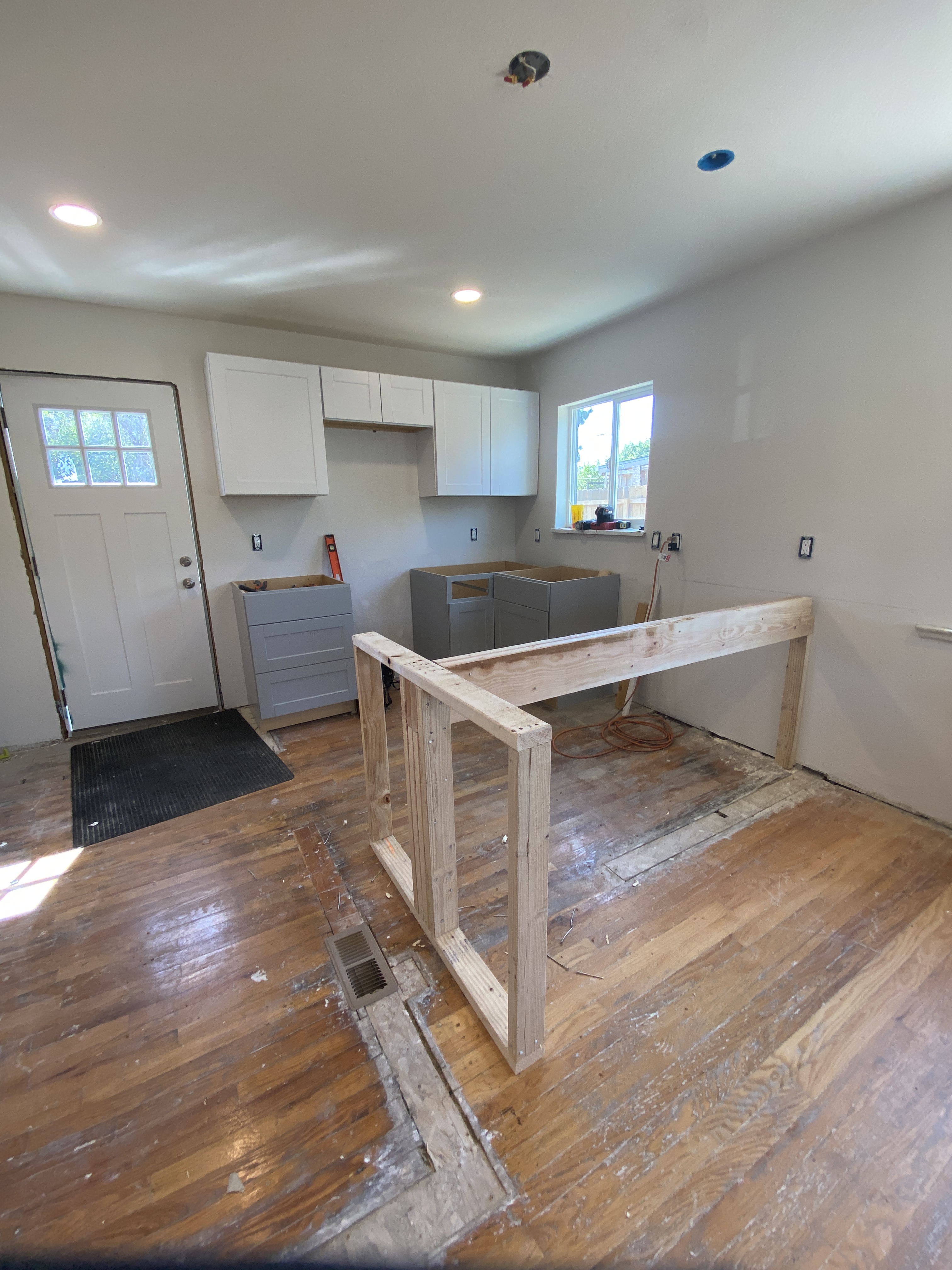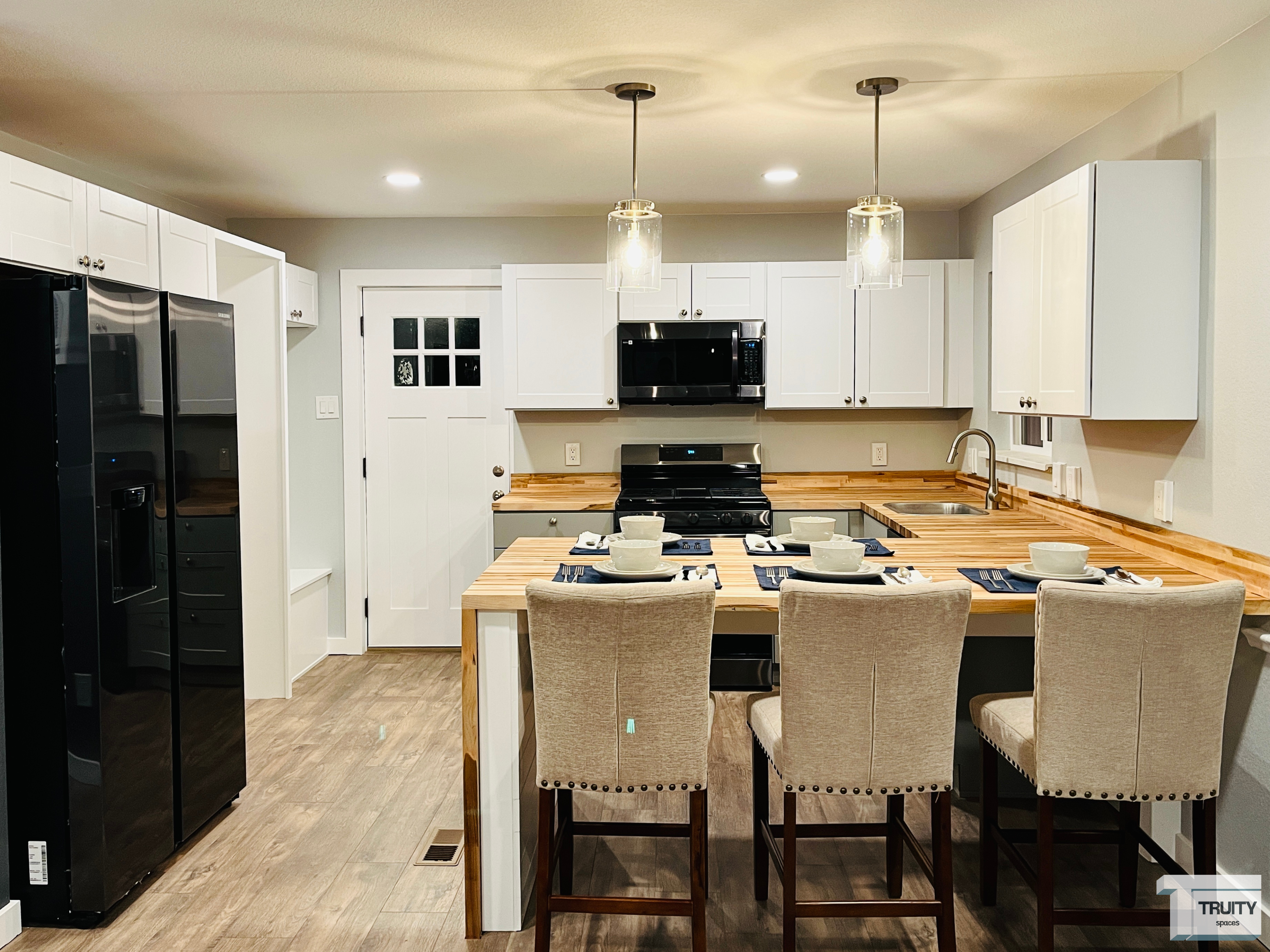 We installed new kitchen cabinets, built a peninsula and placed butcherblock countertops.