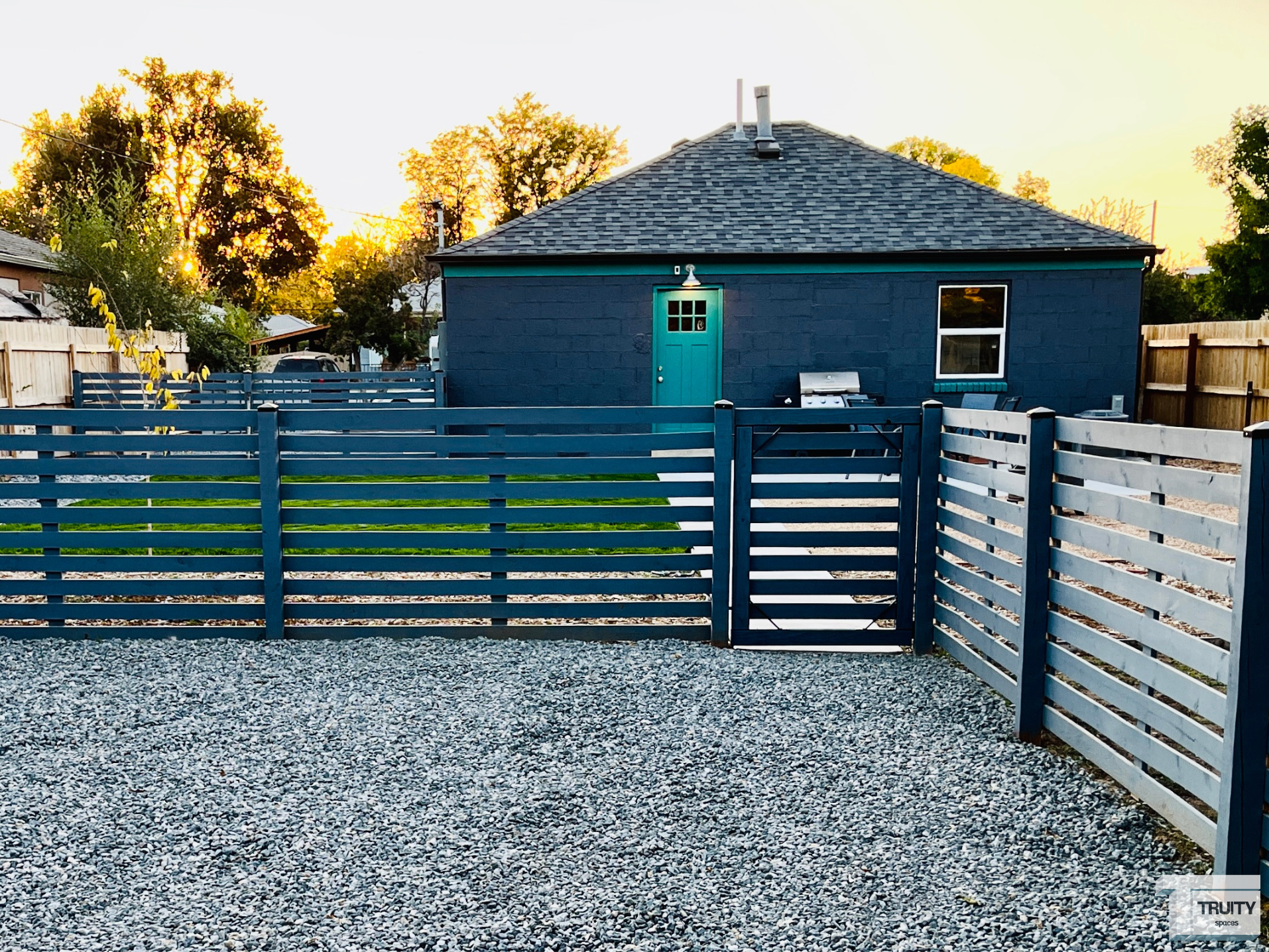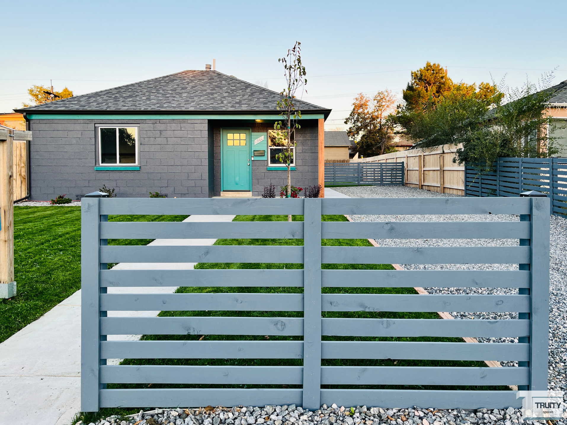 The yard was entirely landscaped with grass, bushes, trees, and gravel. A new privacy fence was built between properties, and a modern stained fence in the front and back.