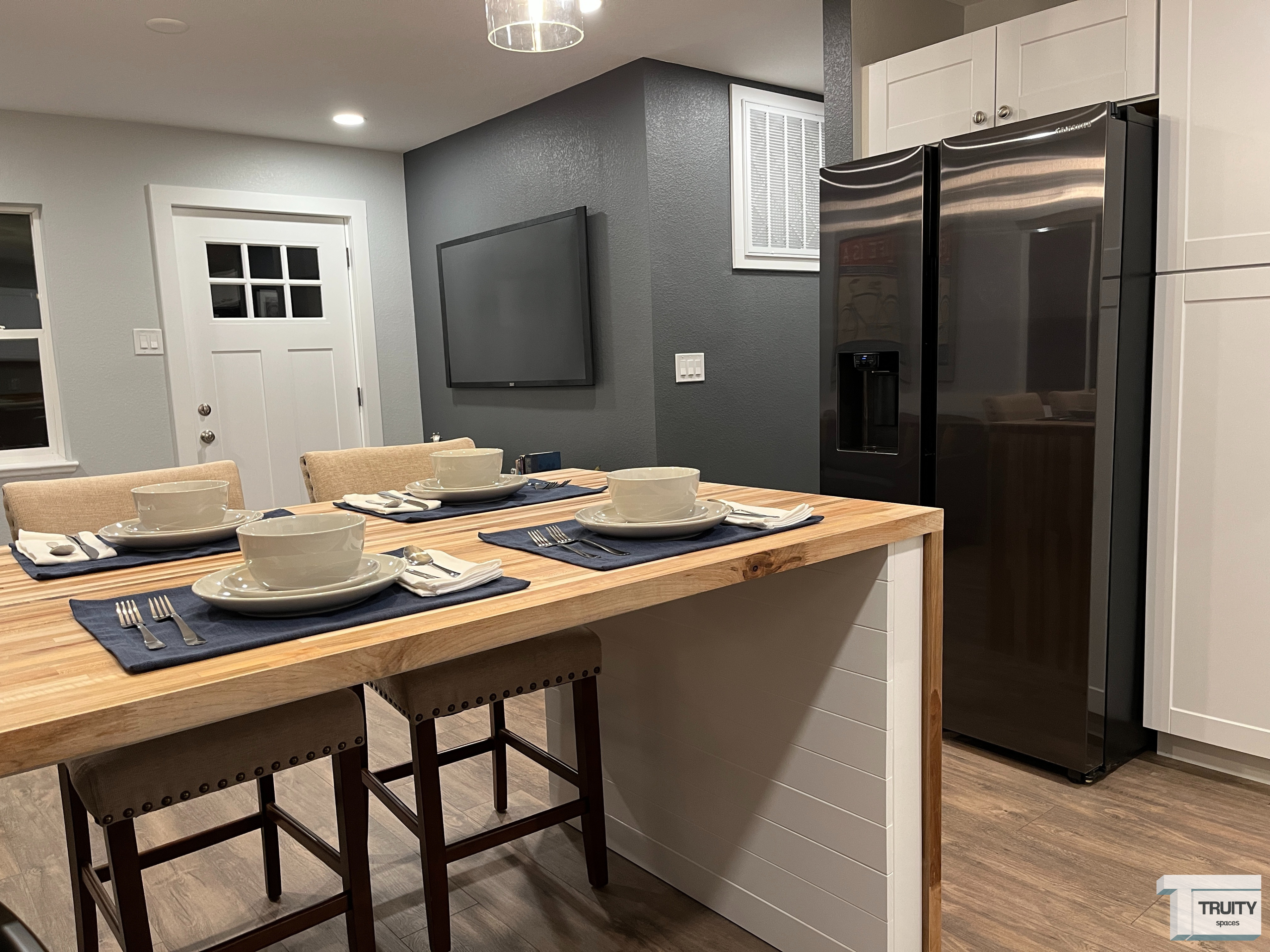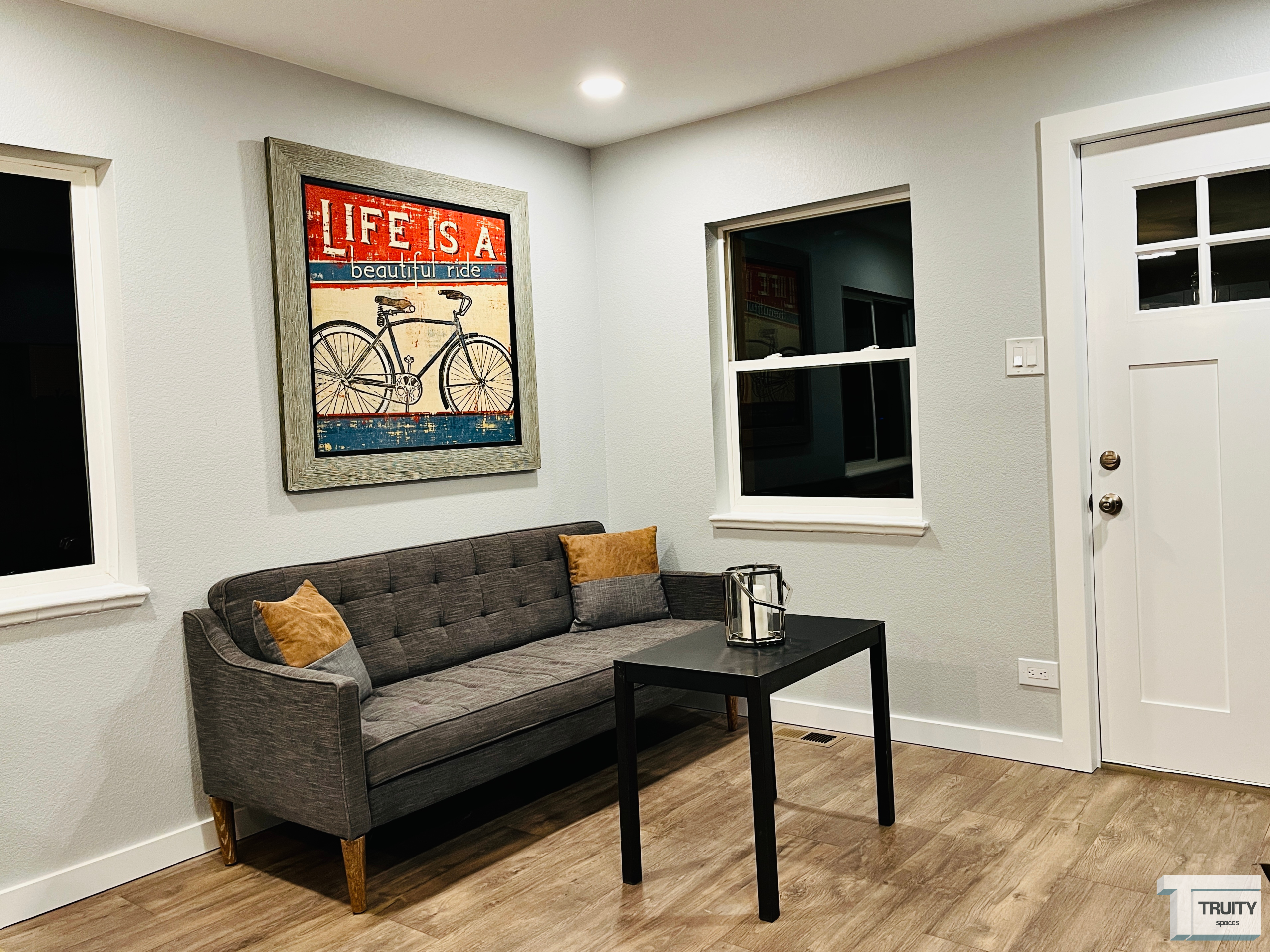 The precious square footage of the home was efficiently redesigned to open up the main room and accommodate a modern kitchen. Washer and dryer hook-ups were integrated into the new kitchen for a space saving stackable set. Some of the living room space was sacrificed to add a desperate needed master closet, while the closet in the second bedroom doubled in size.