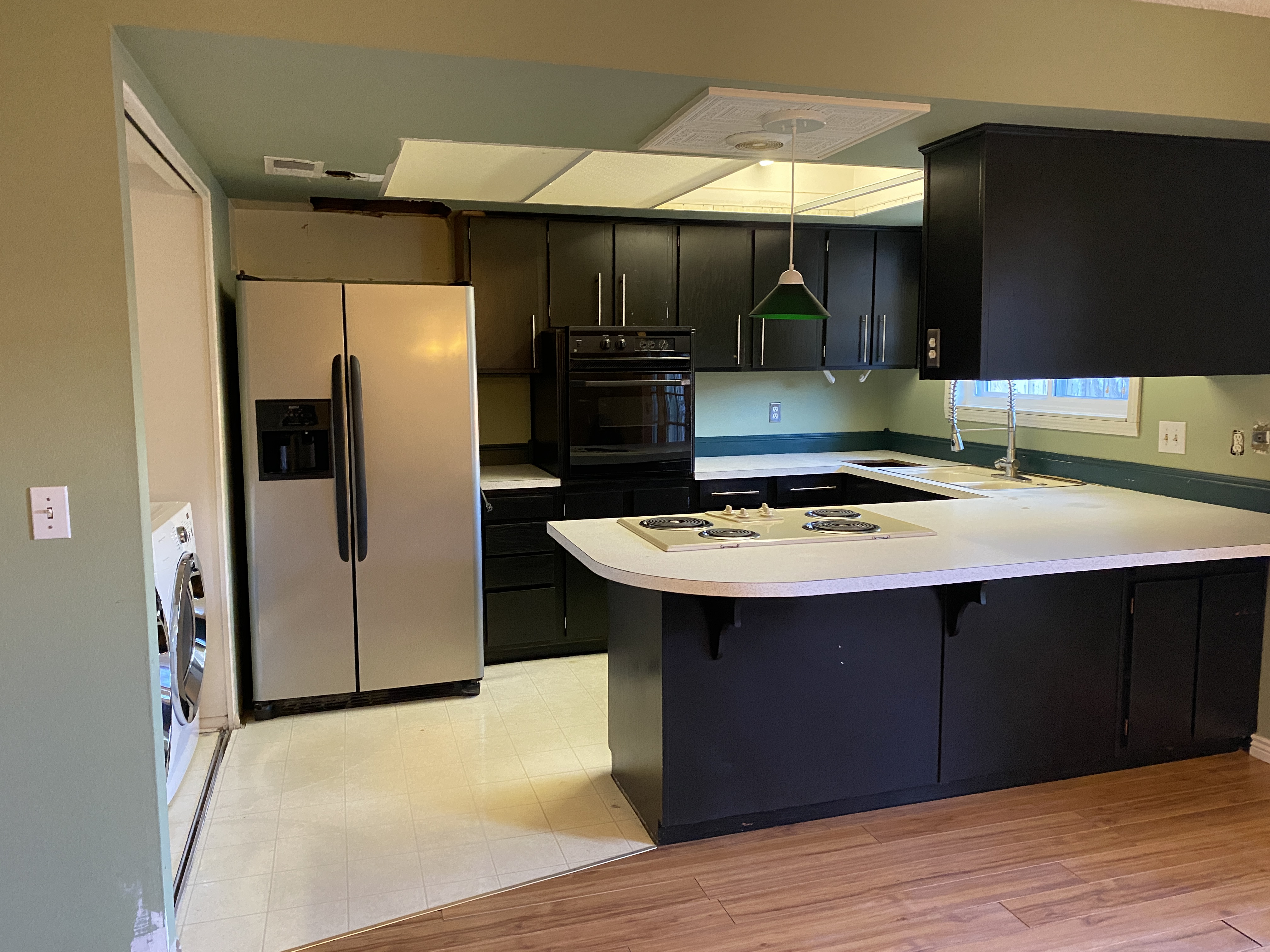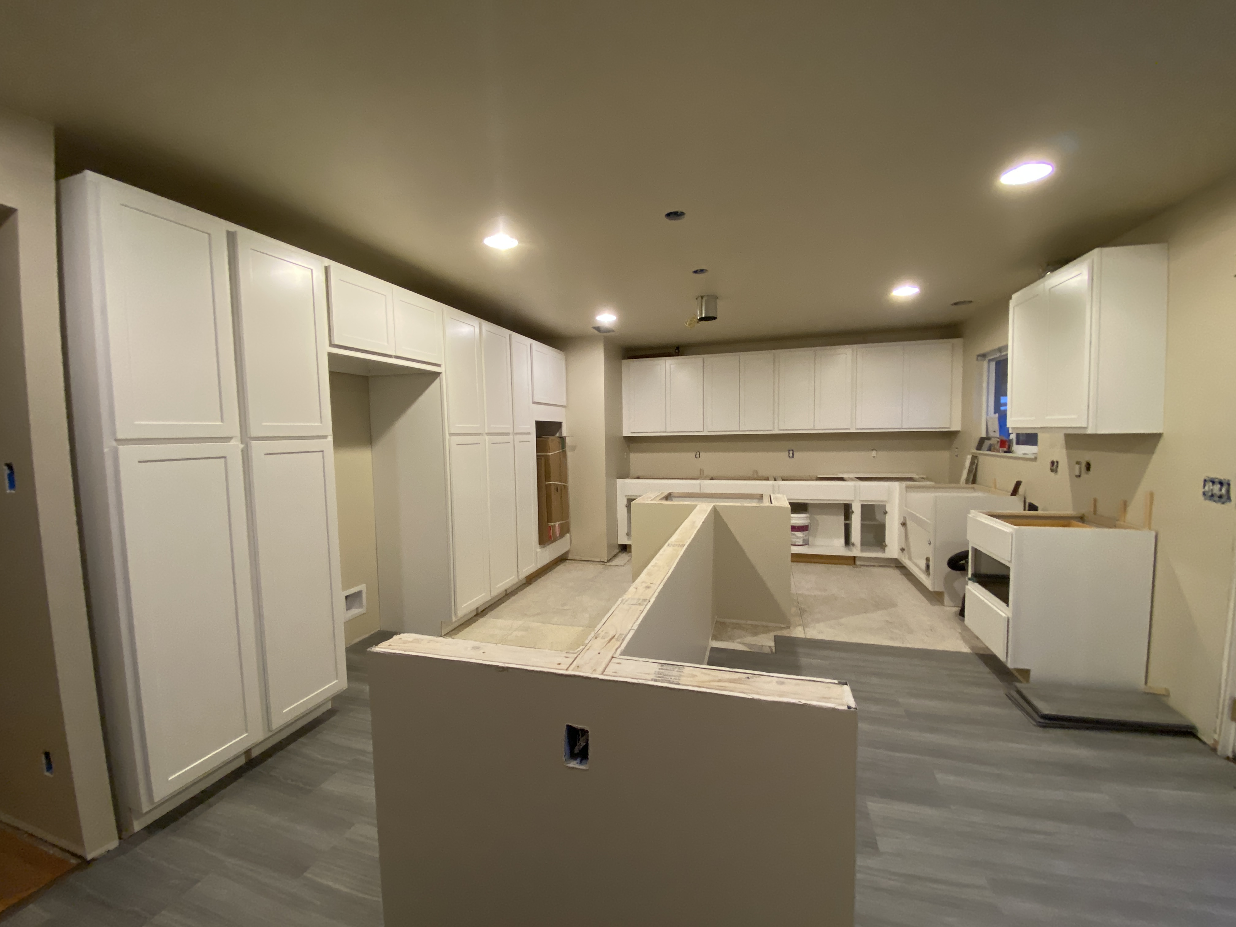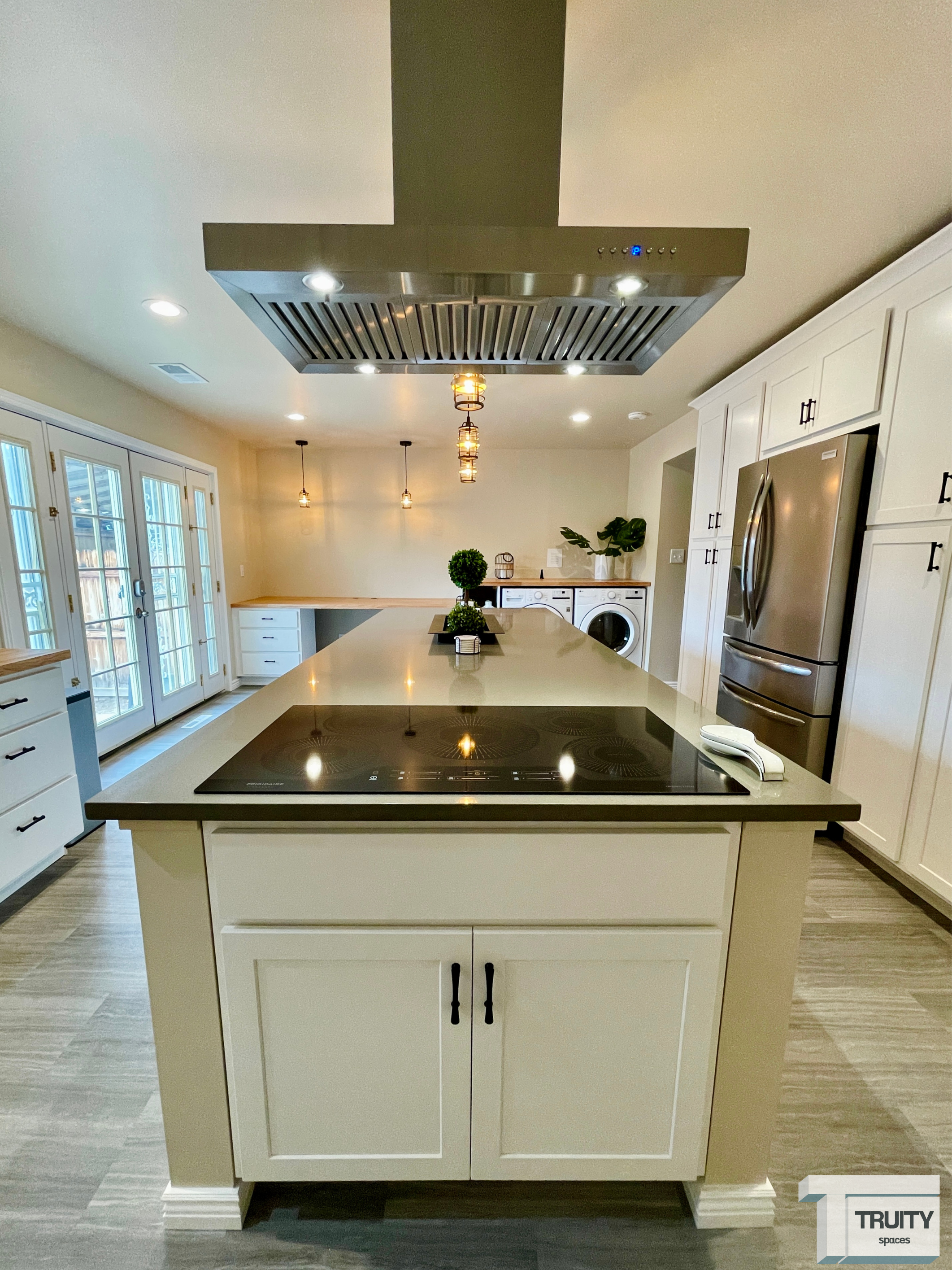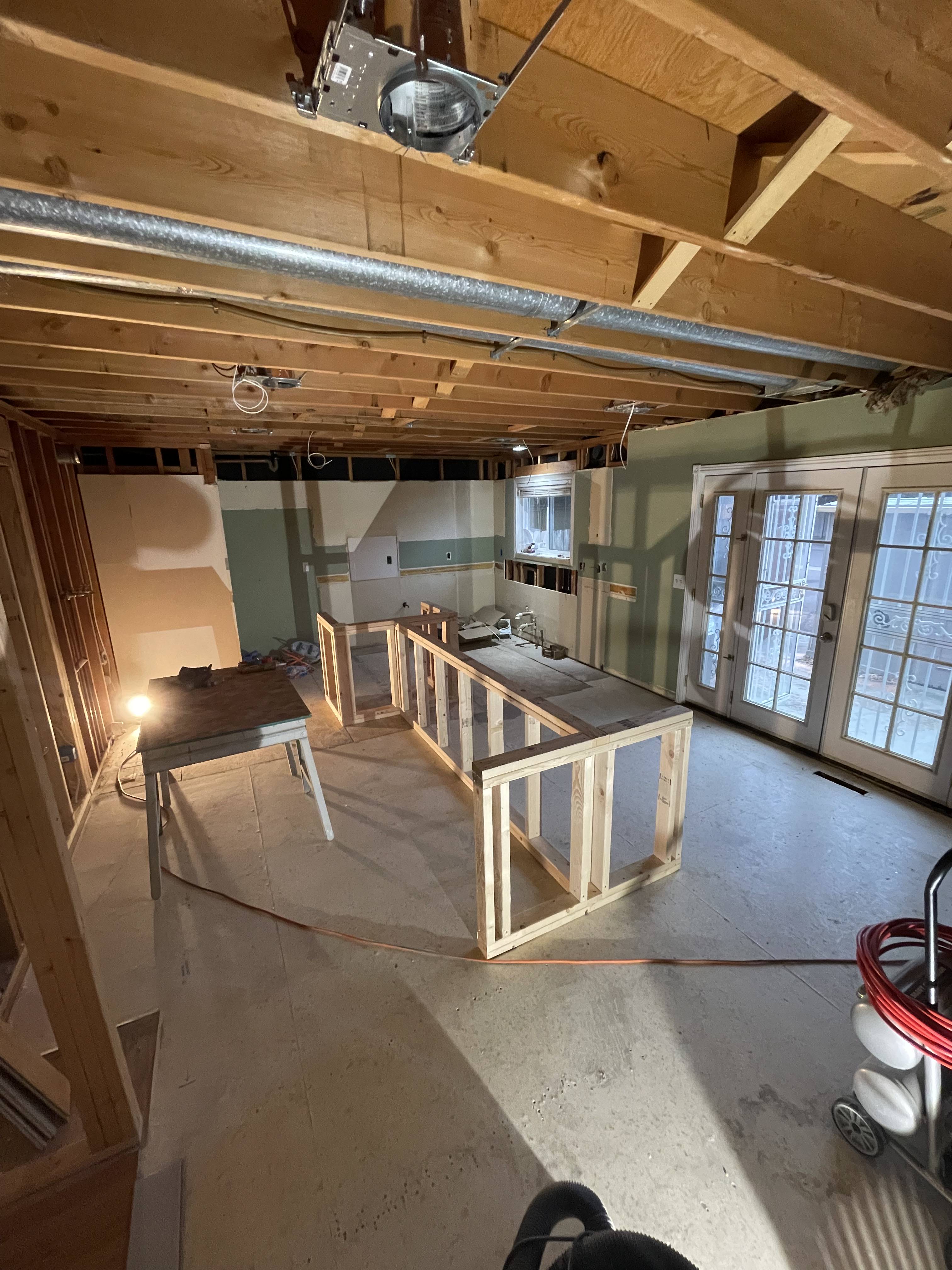 The entire old kitchen was scrapped by removing the existing cabinets, appliances, washer and dryer enclosure, and even the low soffits and the rest of the ceiling. We also eliminated the french doors to accommodate cabinetry and expand the kitchen. We framed the large structure for the new island and replaced the floor. Additionally, venting and electrical systems were updated.