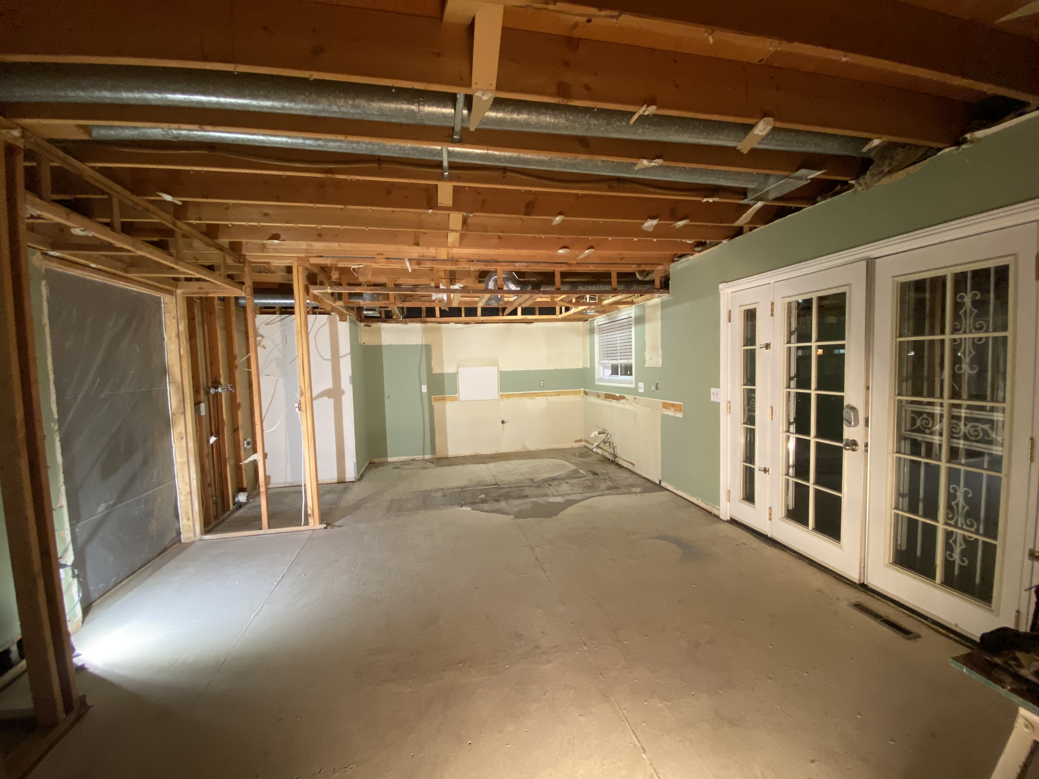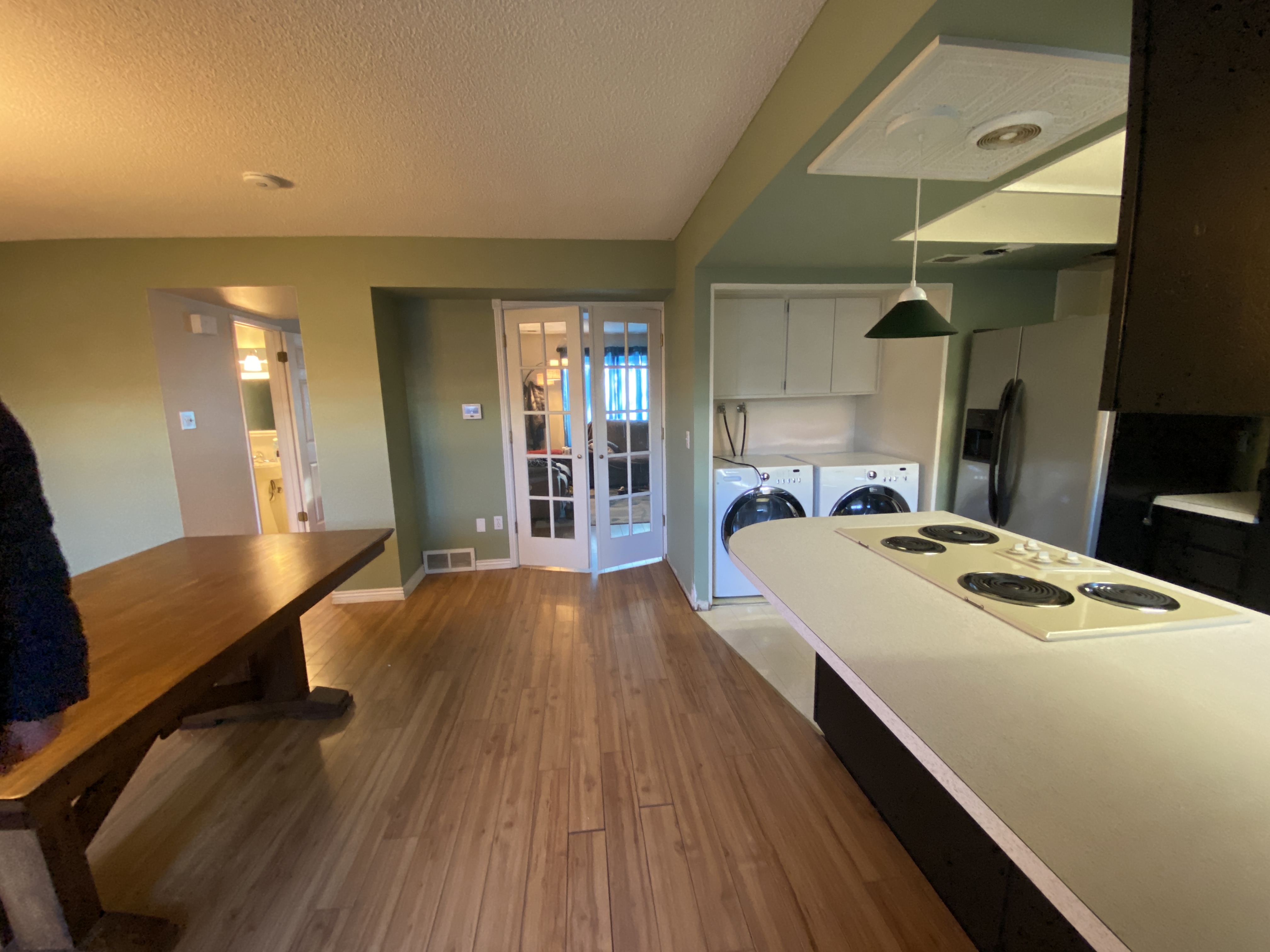 Originally built in the 1960s, this room included a small kitchen with a washer and dryer area while the rest of the space was the dining room. A set of french doors connected the space to the living room.