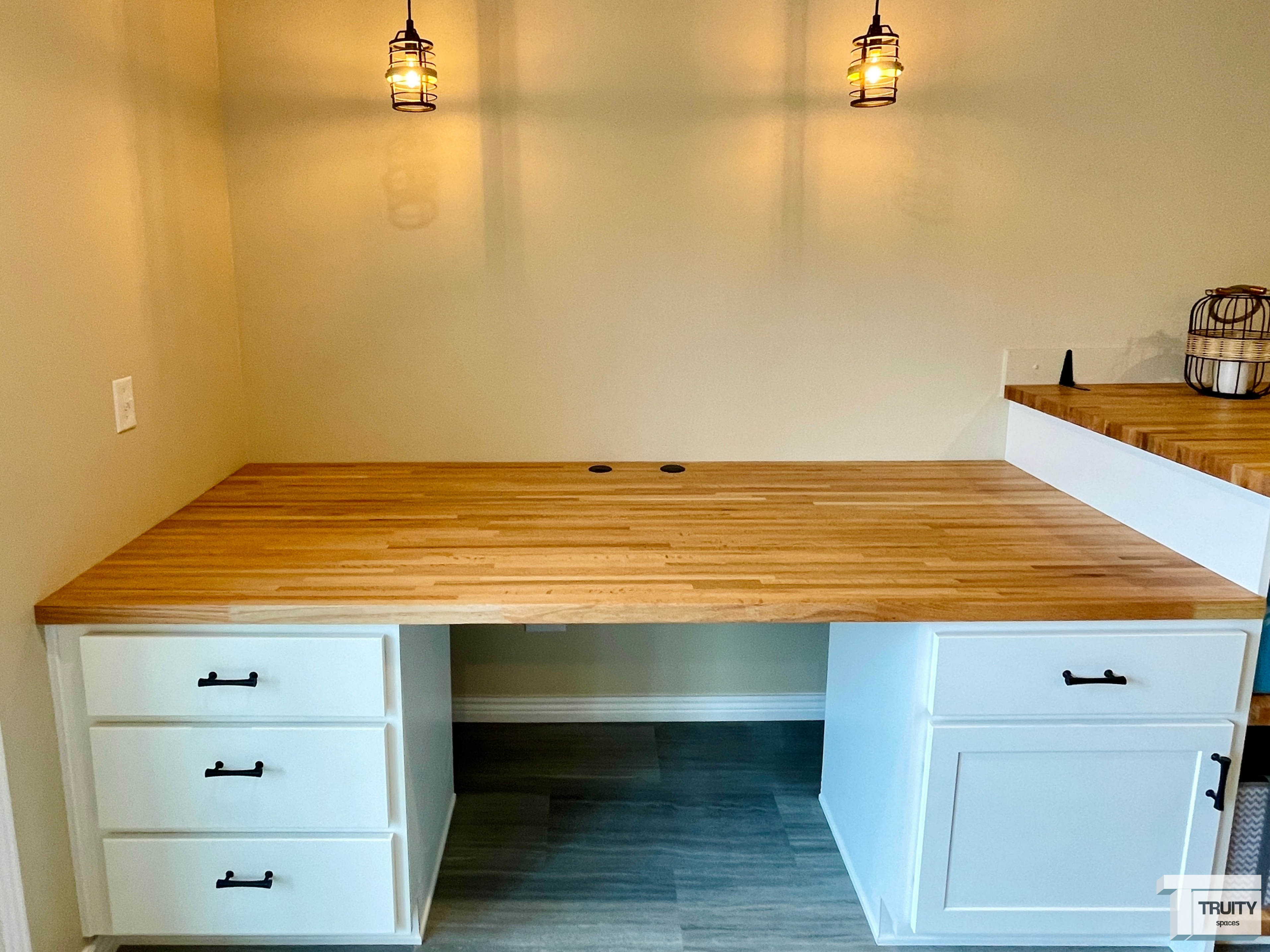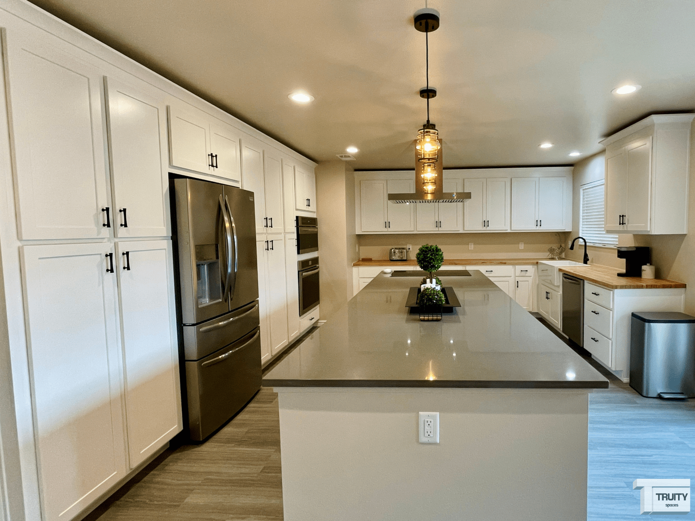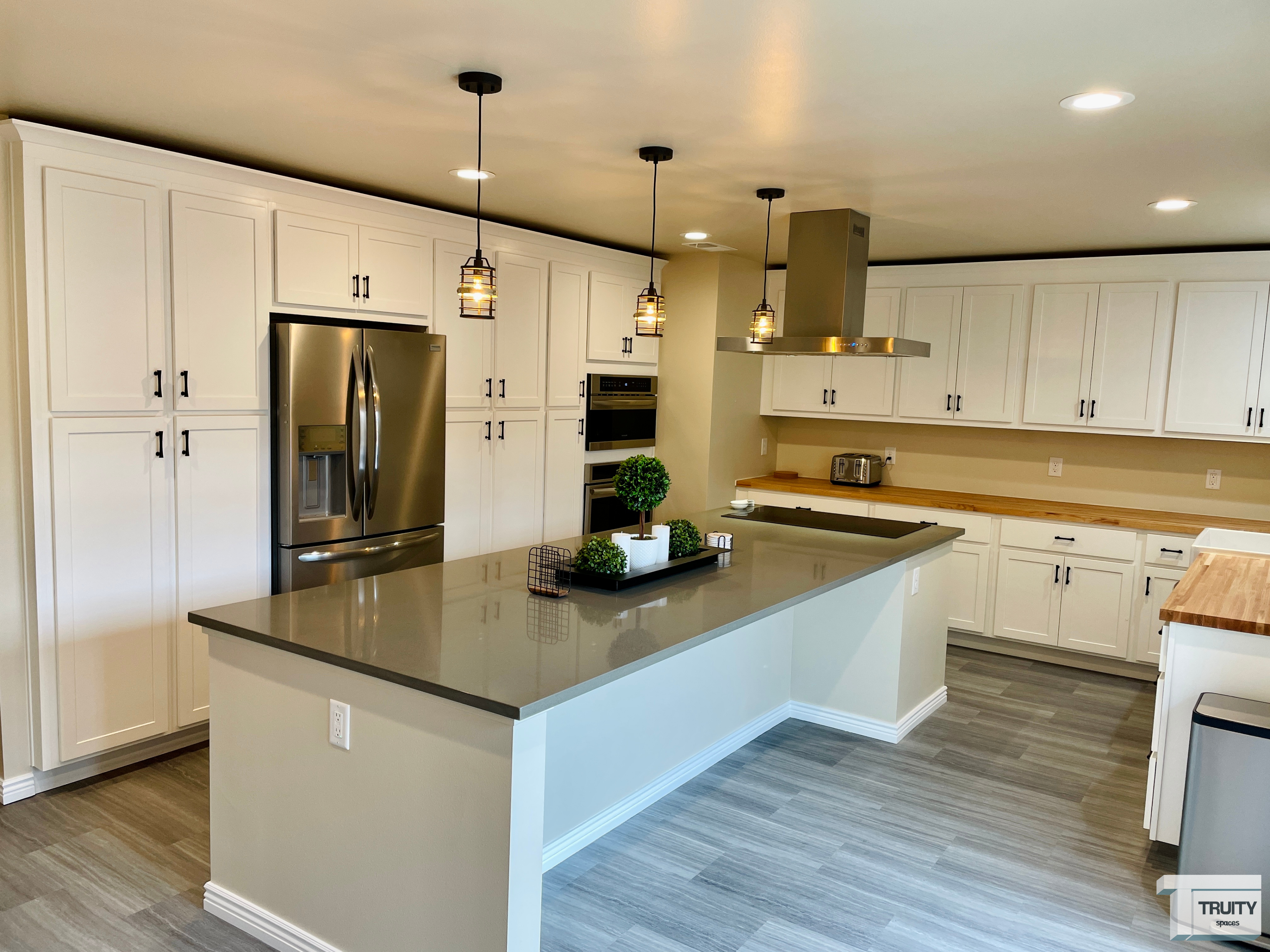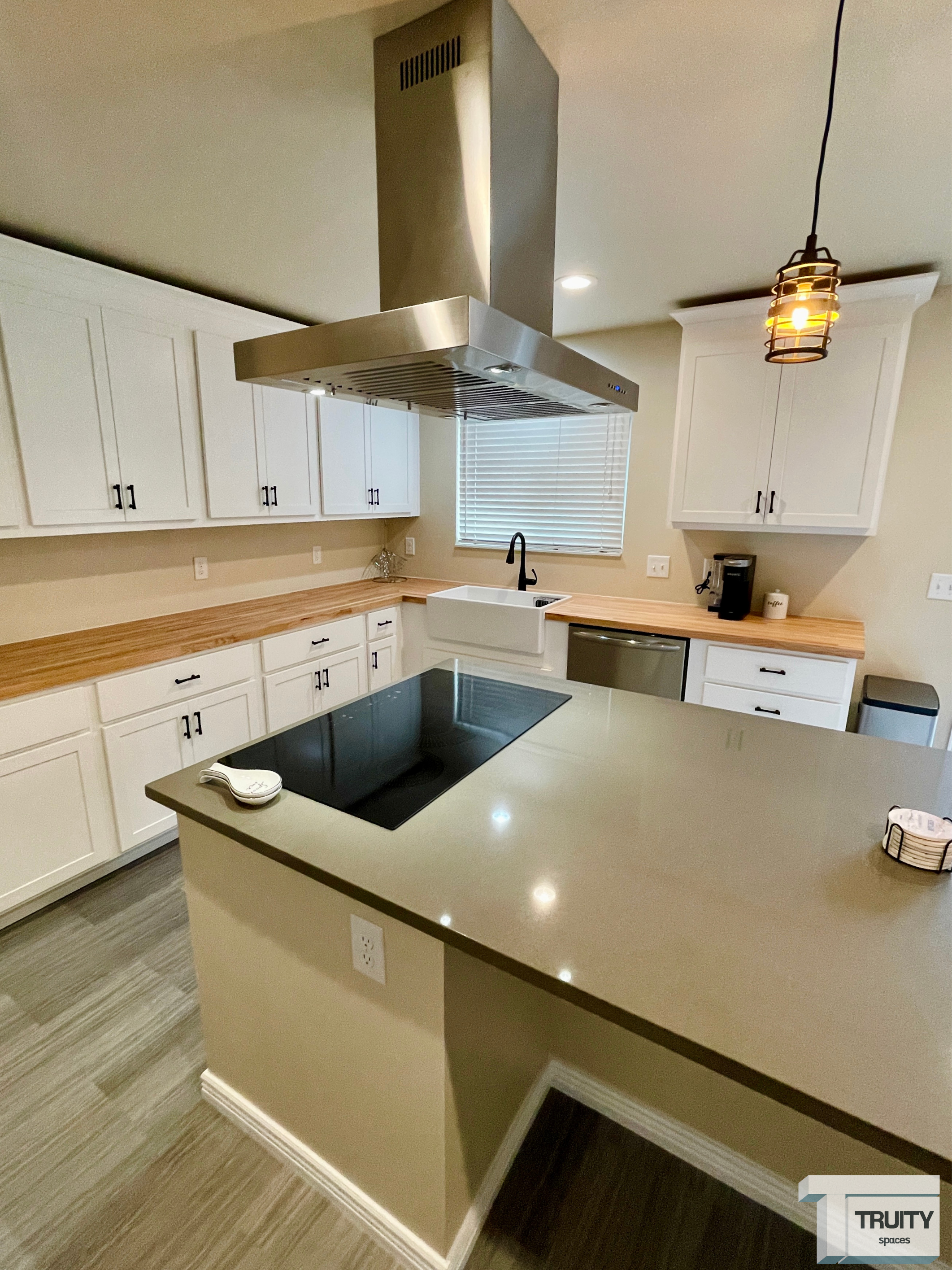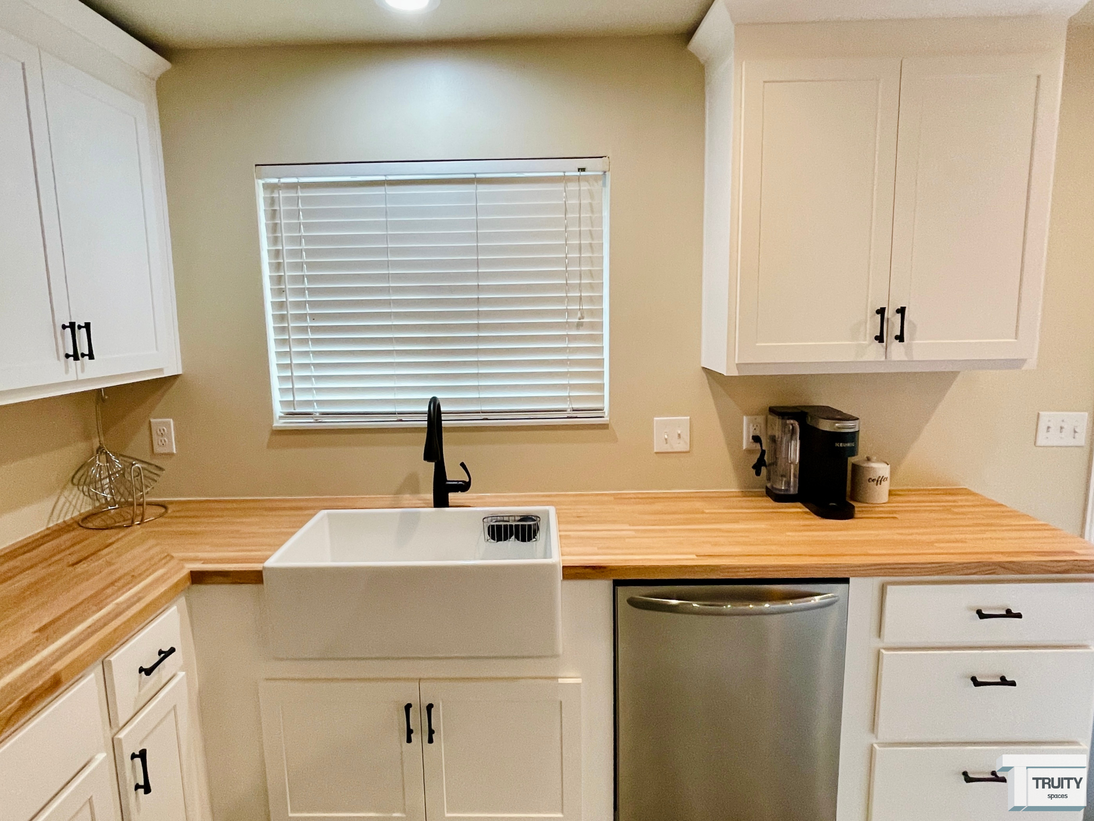 Covering over half of the wall space, bright white cabinets were installed that make for an impressively large kitchen with lots of storage. Butcher block countertops finished in a natural tone were also installed, along with a trendy farmhouse sink and brand new appliances.