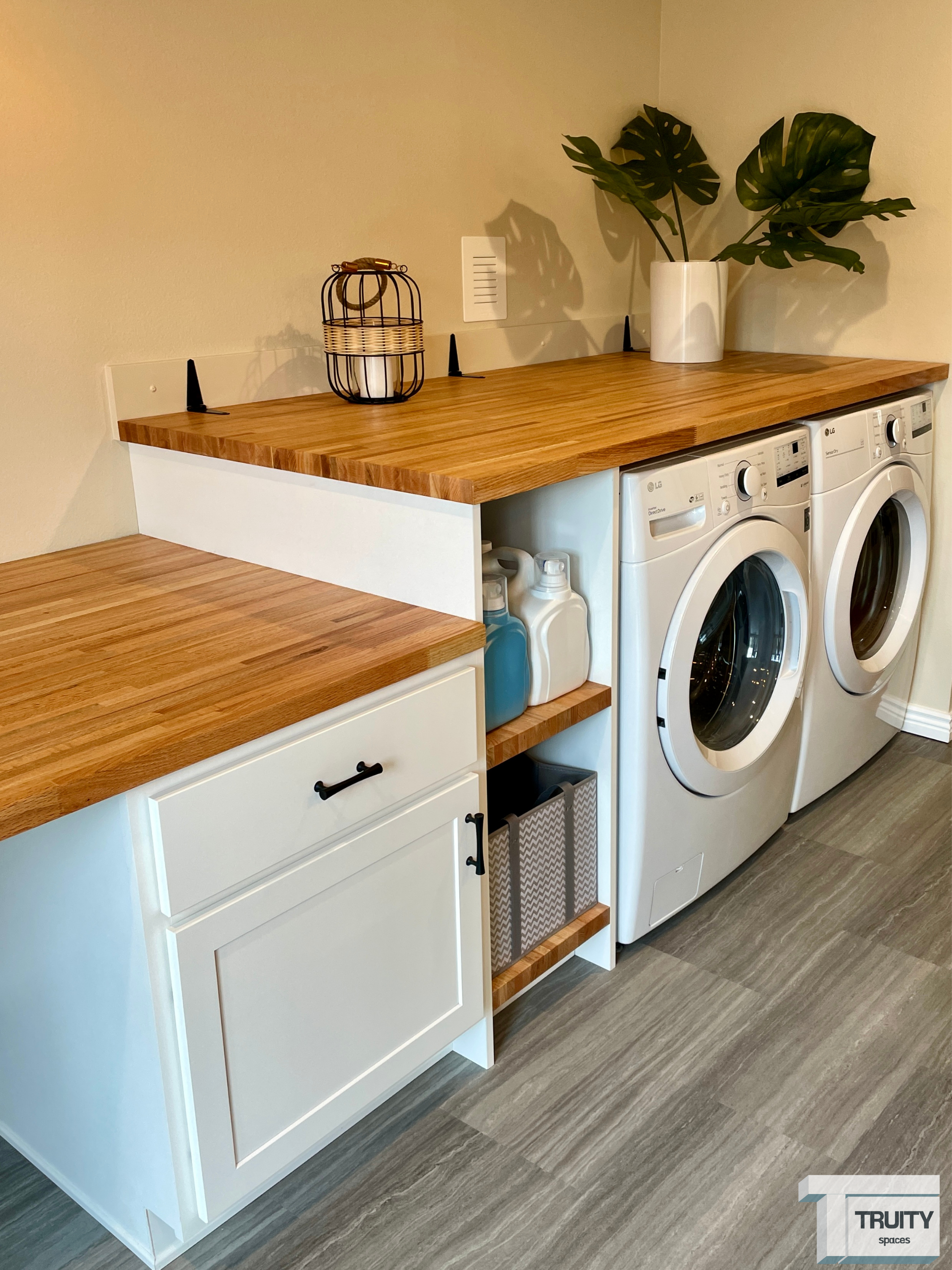 To complete the renovation with the most efficient use of space, we built in a custom washer and dryer enclosure with shelves, and a work station with additional storage. And to finish off this modern and stylish space with a little contrast, we installed black matte hardware and light fixtures.