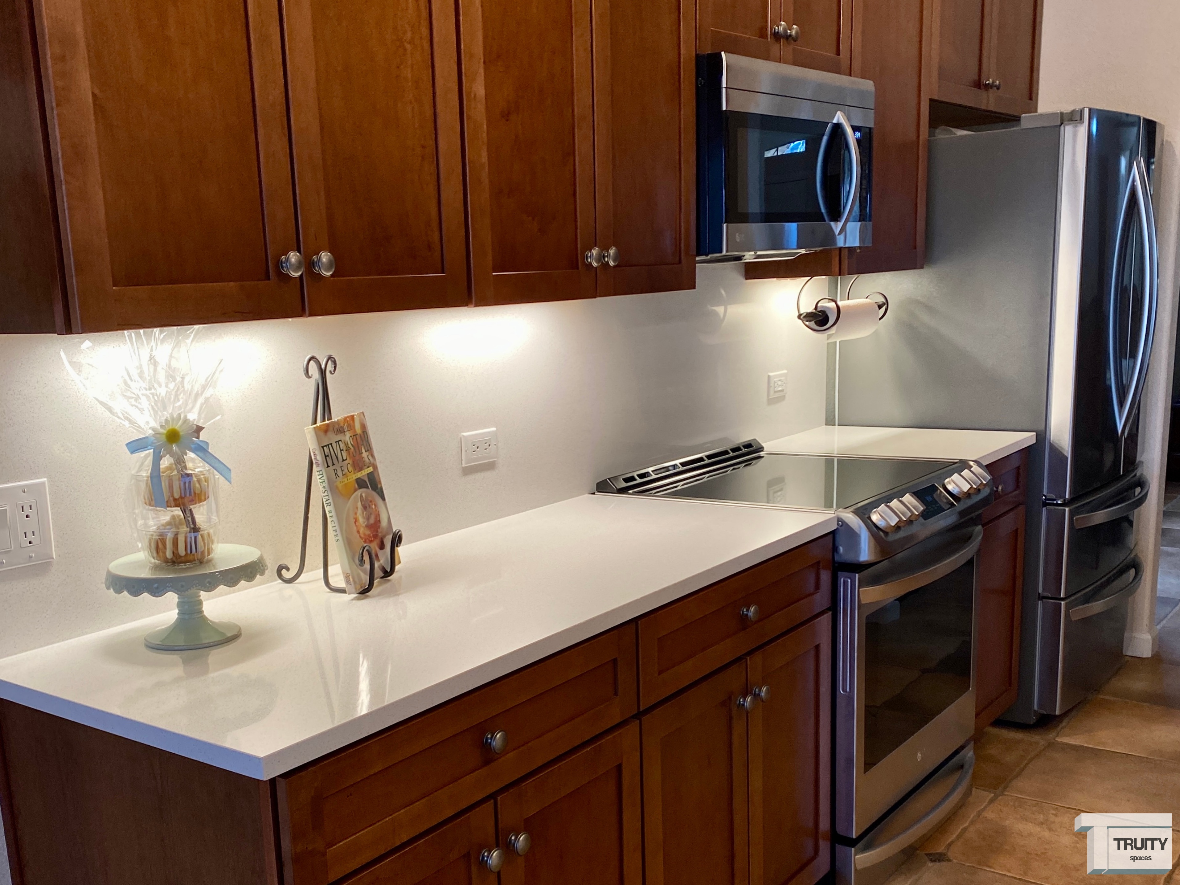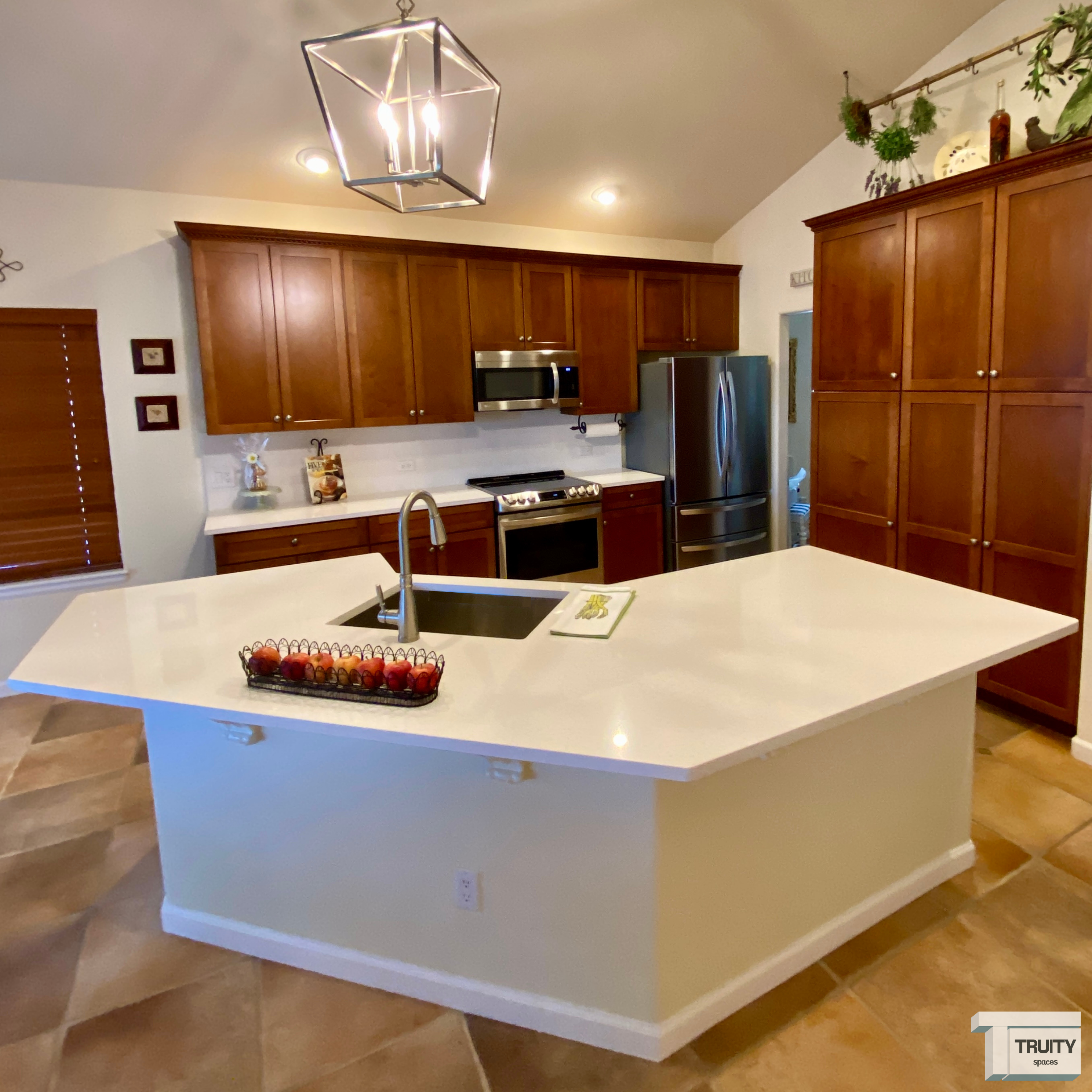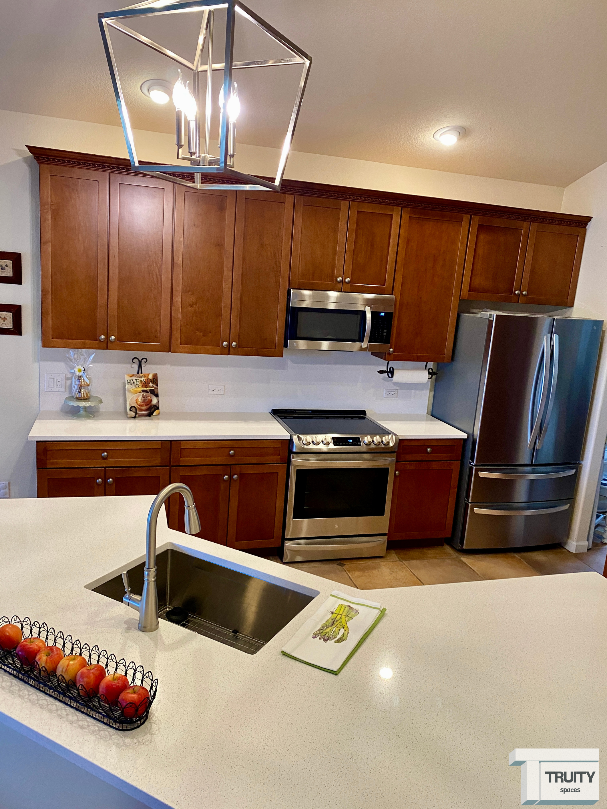 For the new backsplash, we used the same quartz as the countertops which gives the kitchen a bright and modern look. All appliances were replaced with a new stainless steel package, and a slide-in stove that accentuates the backsplash. Lastly, the new pendant light over the island adds the final touch that makes the entire space brilliant and elegant!