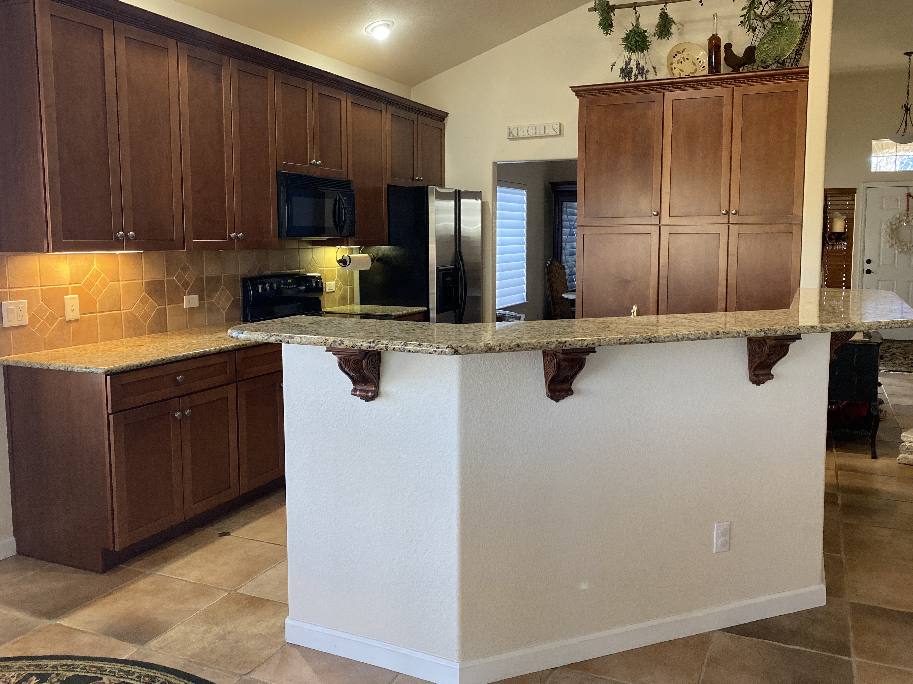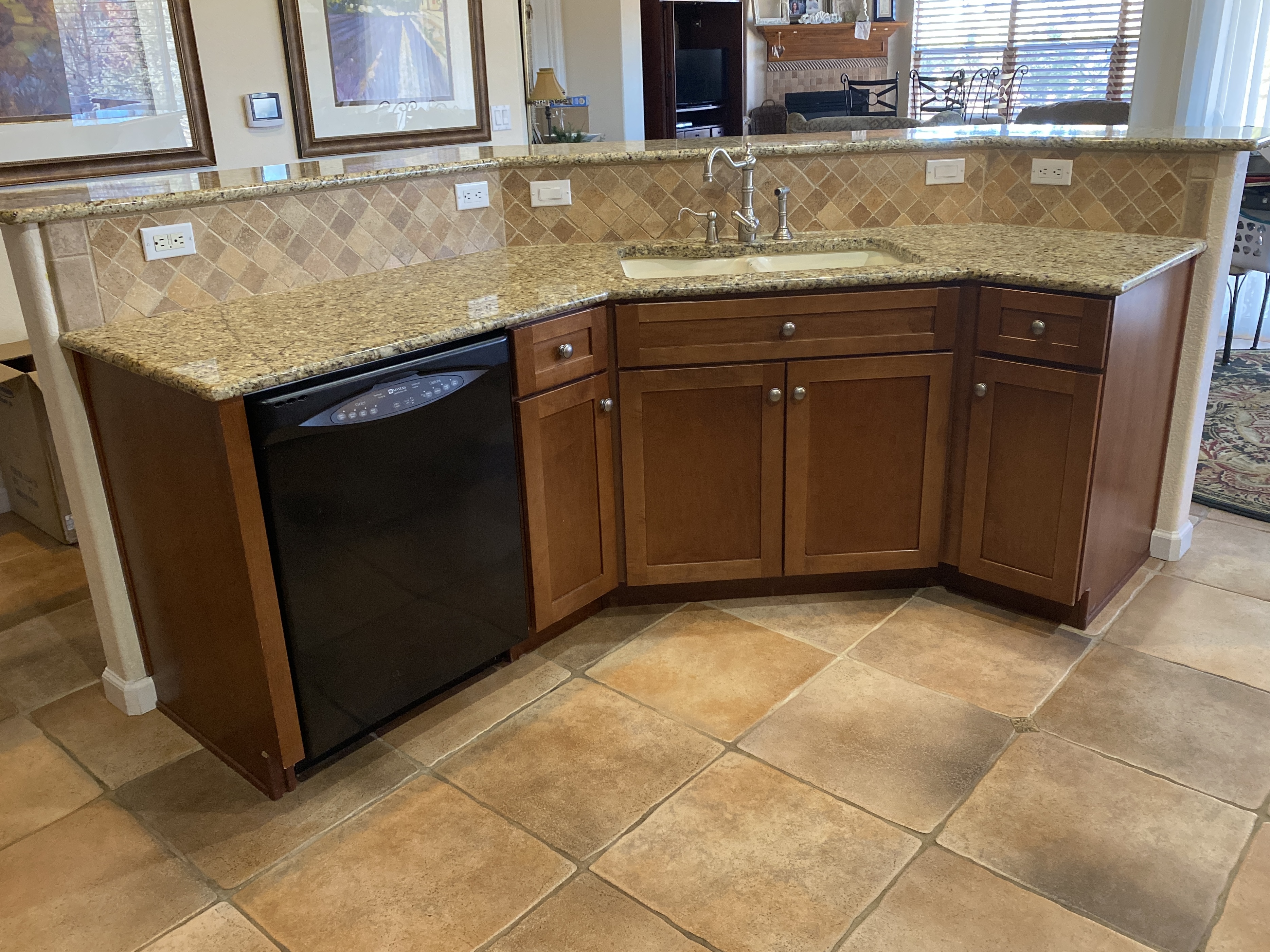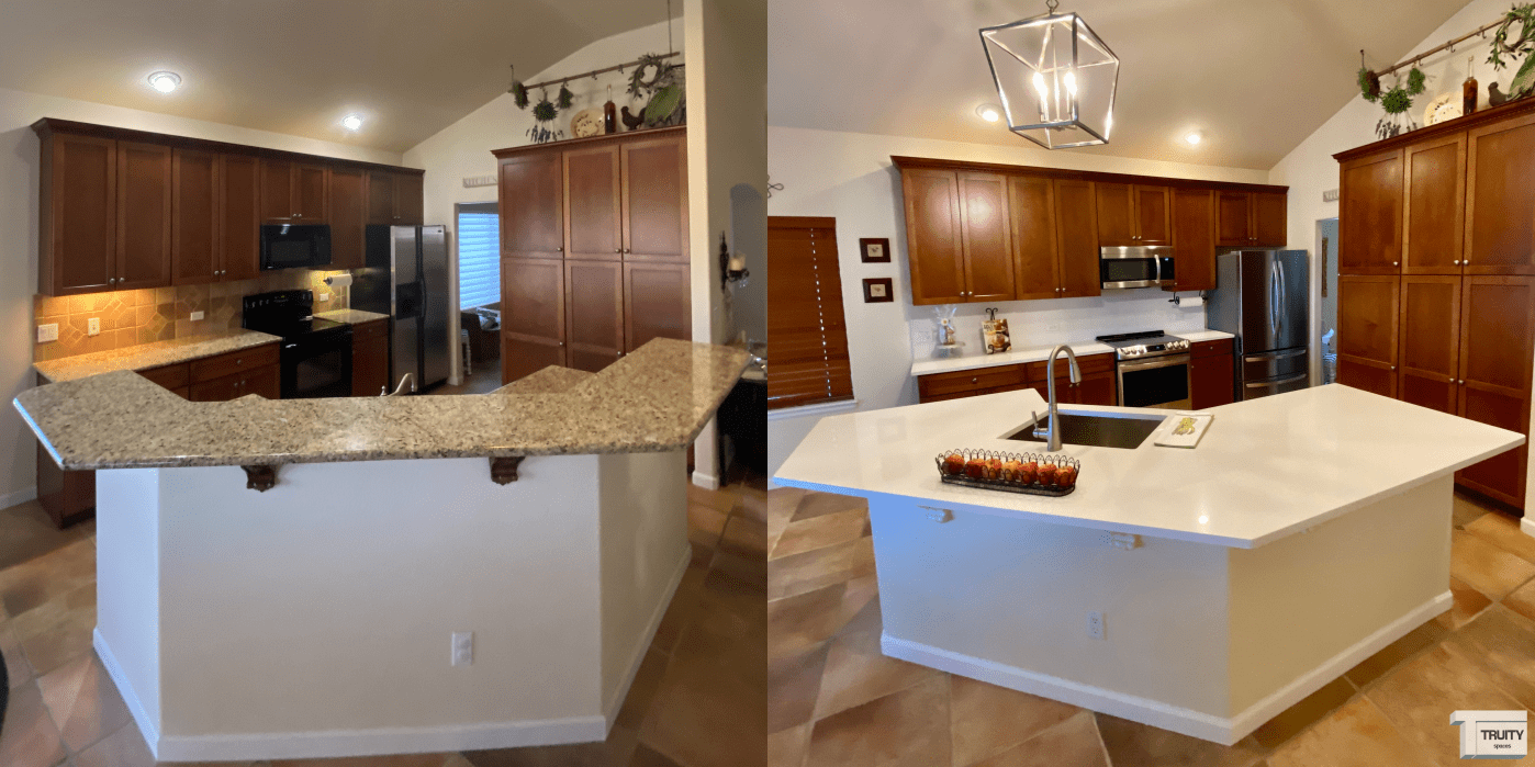 We removed the existing countertops and backsplash, then we trimmed the high counter to accomodate a large, single level countertop.