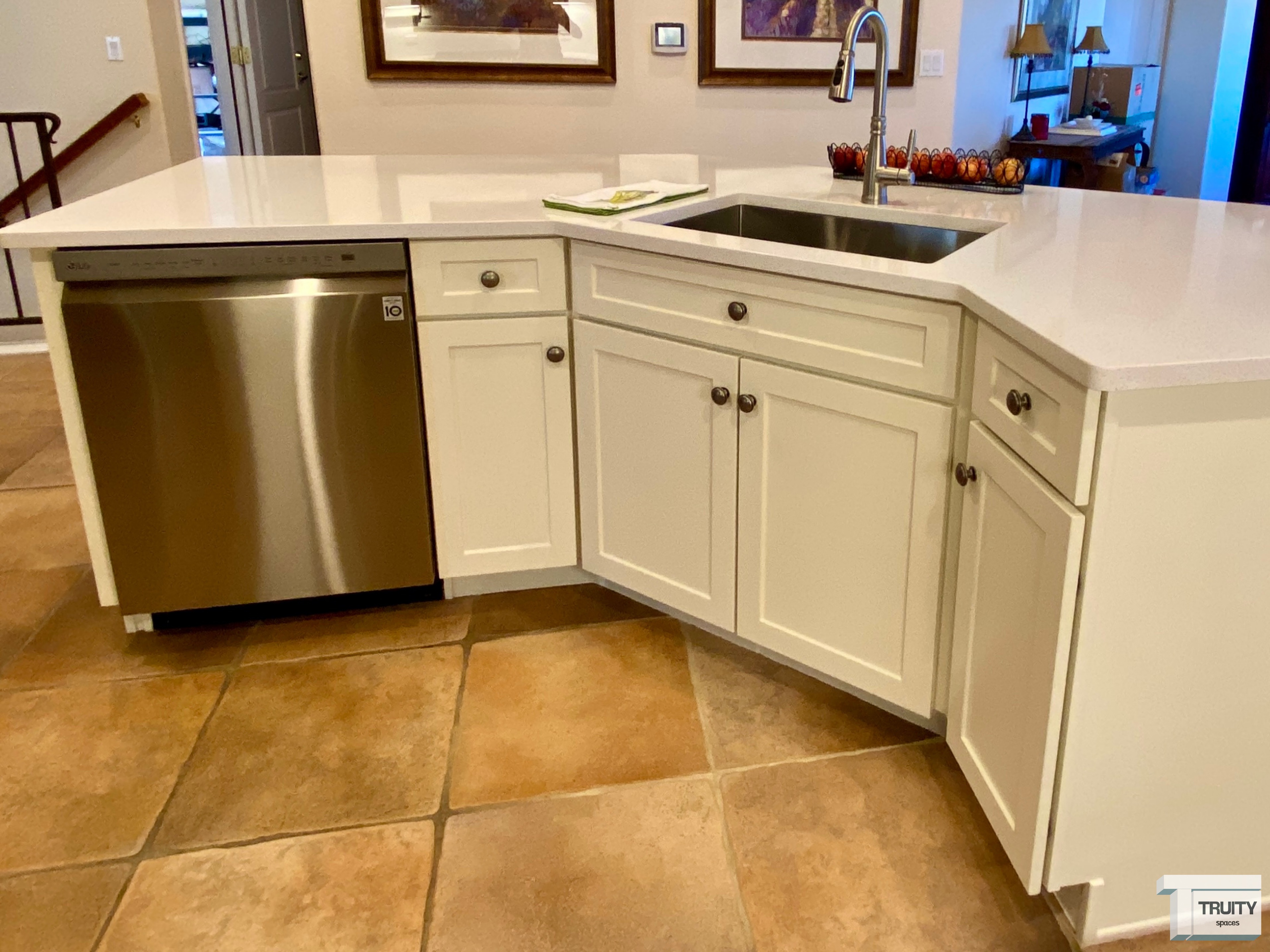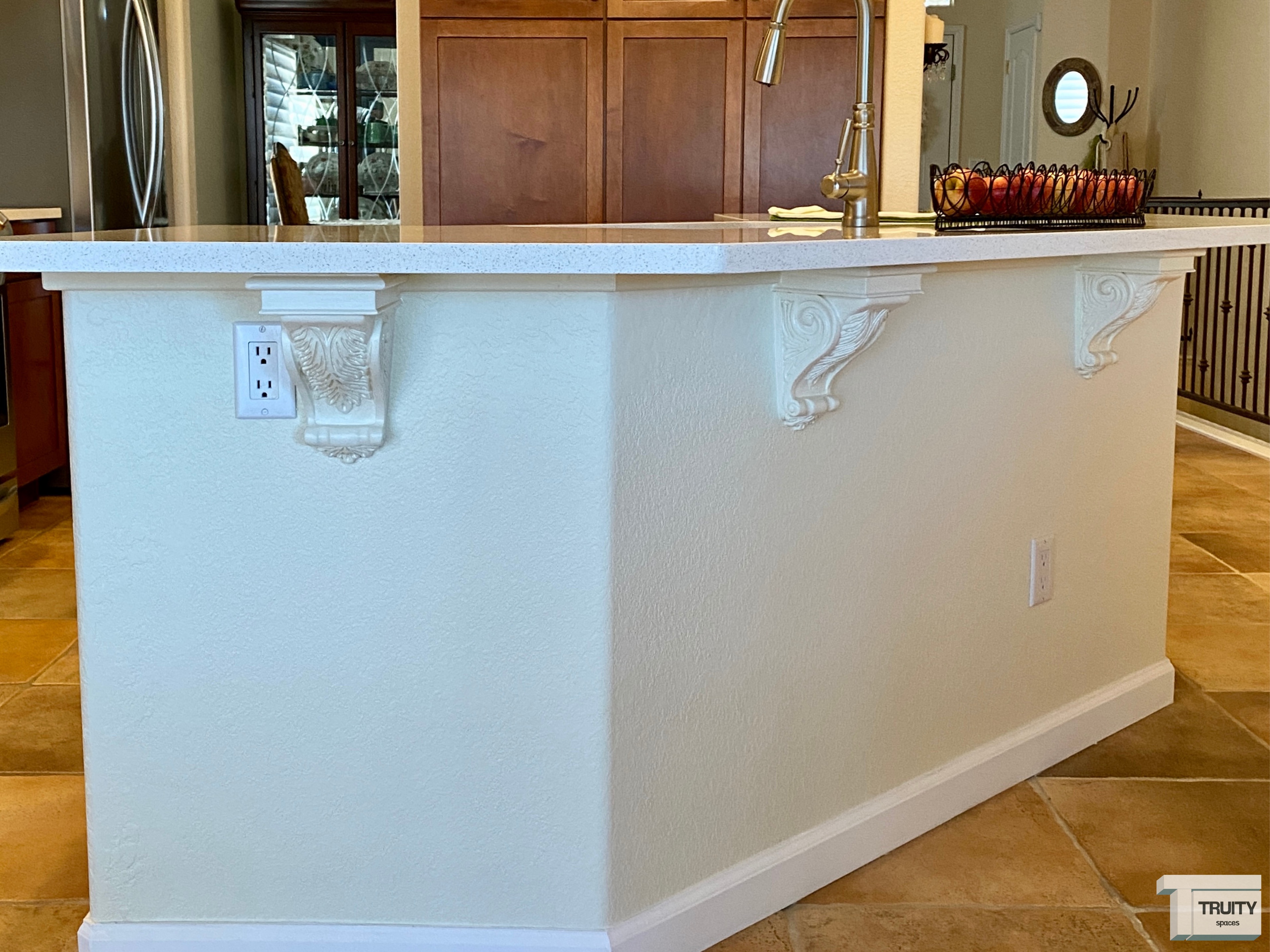 The beautiful new island at regular counter height, was topped with a snow quartz counter that makes the space feel open and inviting. Then we installed a stainless steel under mount sink and modern brushed nickel faucet. The cabinets were painted in a fresh-linen color that resembles the color of the walls; and to preserve and enhance the island’s character, the original corbels were reinstalled and painted.